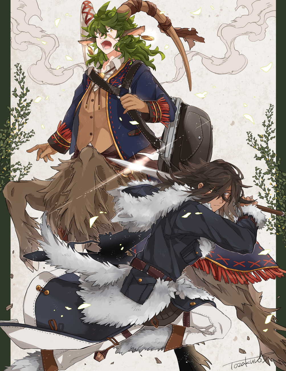 2boys animal_ear_headwear animal_ears artist_name bag belt blue_coat blue_eyes bolo_tie brown_background brown_belt brown_eyes brown_fur brown_gloves brown_hair brown_vest centauroid coat collared_shirt ear_piercing fake_animal_ears fake_tail feet_out_of_frame fur-trimmed_coat fur-trimmed_hood fur-trimmed_legwear fur-trimmed_sleeves fur_trim gloves green_eyes grey_hair grey_shirt hair_between_eyes hand_up heterochromia highres holding holding_sword holding_weapon hood hood_down hooded_coat hooves horn_cover horn_ornament horn_ribbon horns leg_warmers long_hair long_sleeves looking_at_viewer lukas_bergamot male_focus monster_boy multiple_boys open_mouth pants piercing pillarboxed pixiv_fantasia pixiv_fantasia_last_saga plant ribbon running scar scar_on_face sheep_boy sheep_ears sheep_horns sheep_tail shirt shoulder_bag standing sword tail taur tozakuro_s two-sided_coat two-sided_fabric vest weapon white_pants william_cedarwood