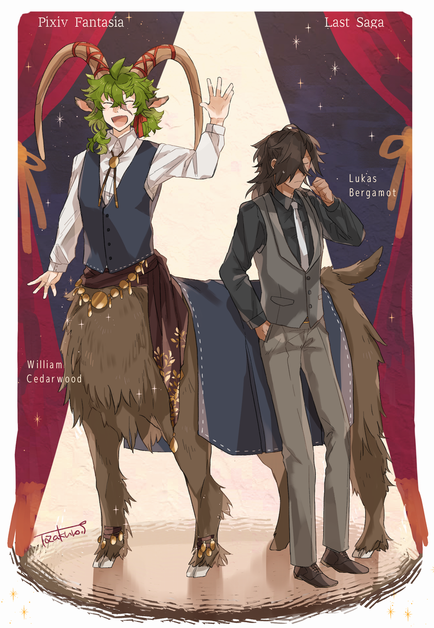 2boys animal_ears artist_name black_shirt blue_vest bolo_tie brown_footwear brown_fur brown_hair centauroid character_name closed_eyes closed_mouth collared_shirt copyright_name curtains dark-skinned_male dark_skin facing_viewer full_body green_hair grey_pants grey_vest hair_over_one_eye hand_up highres hooves horn_ornament horn_ribbon horns indoors long_sleeves lukas_bergamot male_focus monster_boy multiple_boys necktie open_mouth pants pixiv_fantasia pixiv_fantasia_last_saga ribbon sheep_boy sheep_ears sheep_horns sheep_tail shirt spotlight standing tail taur tozakuro_s vest white_necktie white_shirt william_cedarwood