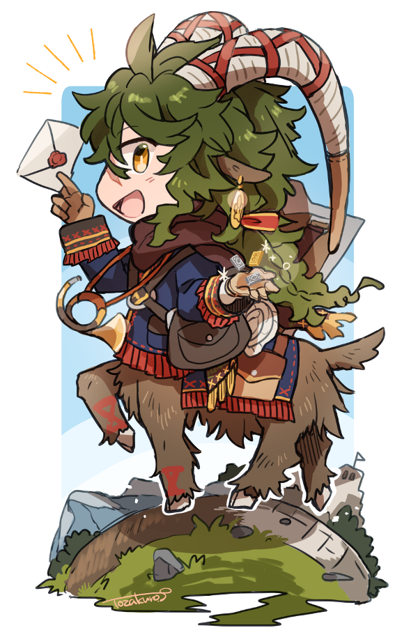 1boy animal_ears artist_name bag blue_background blue_coat brown_eyes brown_fur brown_gloves brown_scarf centauroid chibi coat ear_piercing envelope full_body gloves grass green_hair hands_up holding holding_envelope hooves horn_cover horn_ornament horn_ribbon horns instrument long_hair looking_at_viewer mailman male_focus monster_boy open_mouth outdoors piercing pixiv_fantasia pixiv_fantasia_last_saga ribbon rock rope satchel scar scar_on_face scarf sheep_boy sheep_ears sheep_horns sheep_tail shield shoulder_bag solo standing tail taur tozakuro_s walking william_cedarwood wooden_shield