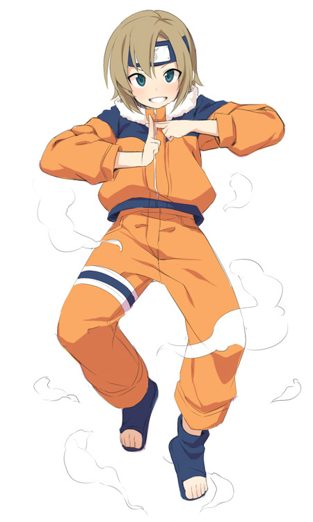 1girl blue_boots boots brown_hair cosplay forehead_protector full_body grin idolmaster idolmaster_cinderella_girls jacket kuji-in long_sleeves looking_at_viewer naruto_(classic) naruto_(series) open-toe_boots orange_jacket orange_pants pants revision simple_background smile smoke solo tada_riina uccow uzumaki_naruto uzumaki_naruto_(cosplay) white_background