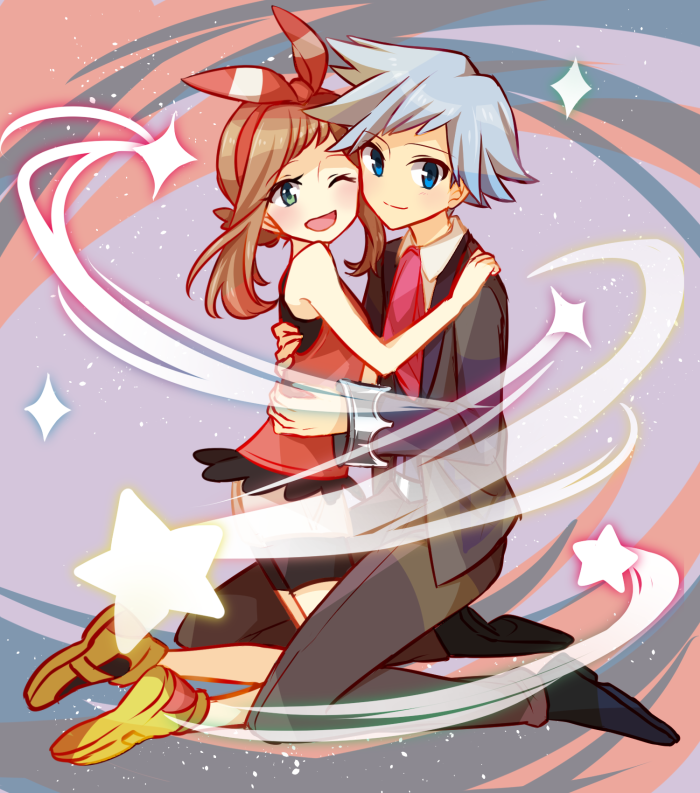 1boy 1girl ;d bare_shoulders black_jacket black_pants blue_eyes blue_hair bow brown_hair full_body hair_bow hari611 jacket looking_at_viewer may_(pokemon) nintendo one_eye_closed open_mouth pants pokemon pokemon_omega_ruby_and_alpha_sapphire red_bow red_shirt shirt shorts sleeveless sleeveless_shirt smile star_(symbol) steven_stone