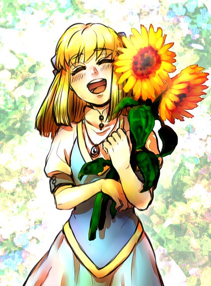 1girl :d aged_down blush bow closed_eyes dress flower gensou_suikoden gensou_suikoden_iii hair_bow ikunosake jewelry long_hair necklace open_mouth sarah_(suikoden_iii) smile solo sunflower