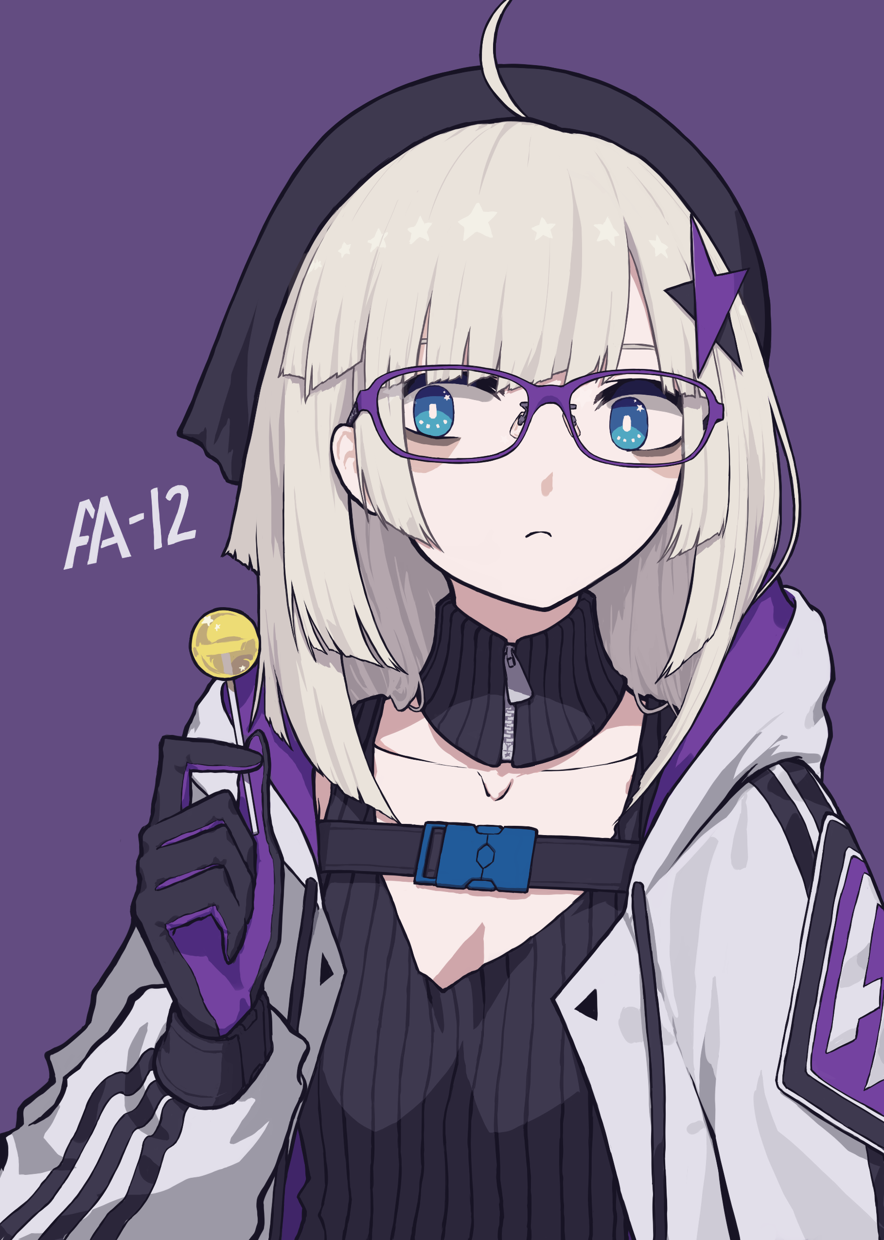 1girl aa-12_(girls'_frontline) absurdres ahoge bags_under_eyes bespectacled black_gloves black_headwear black_jacket black_shirt blue_eyes blue_headwear blunt_bangs blunt_ends breasts bright_pupils buckle candy character_name closed_mouth collarbone commentary detached_collar drawstring food frown girls'_frontline glasses gloves hair_ornament highres holding holding_food hood hood_down hooded_jacket jacket lollipop long_sleeves looking_away medium_hair multicolored_jacket open_clothes open_jacket pale_skin papaia_(quentingqoo) purple-framed_eyewear purple_background purple_gloves purple_jacket shirt simple_background sleeveless sleeveless_shirt small_breasts snap-fit_buckle solo star_(symbol) star_hair_ornament star_in_eye striped_clothes striped_jacket symbol_in_eye triangle turtleneck two-tone_gloves upper_body weapon_name white_hair white_jacket white_pupils zipper