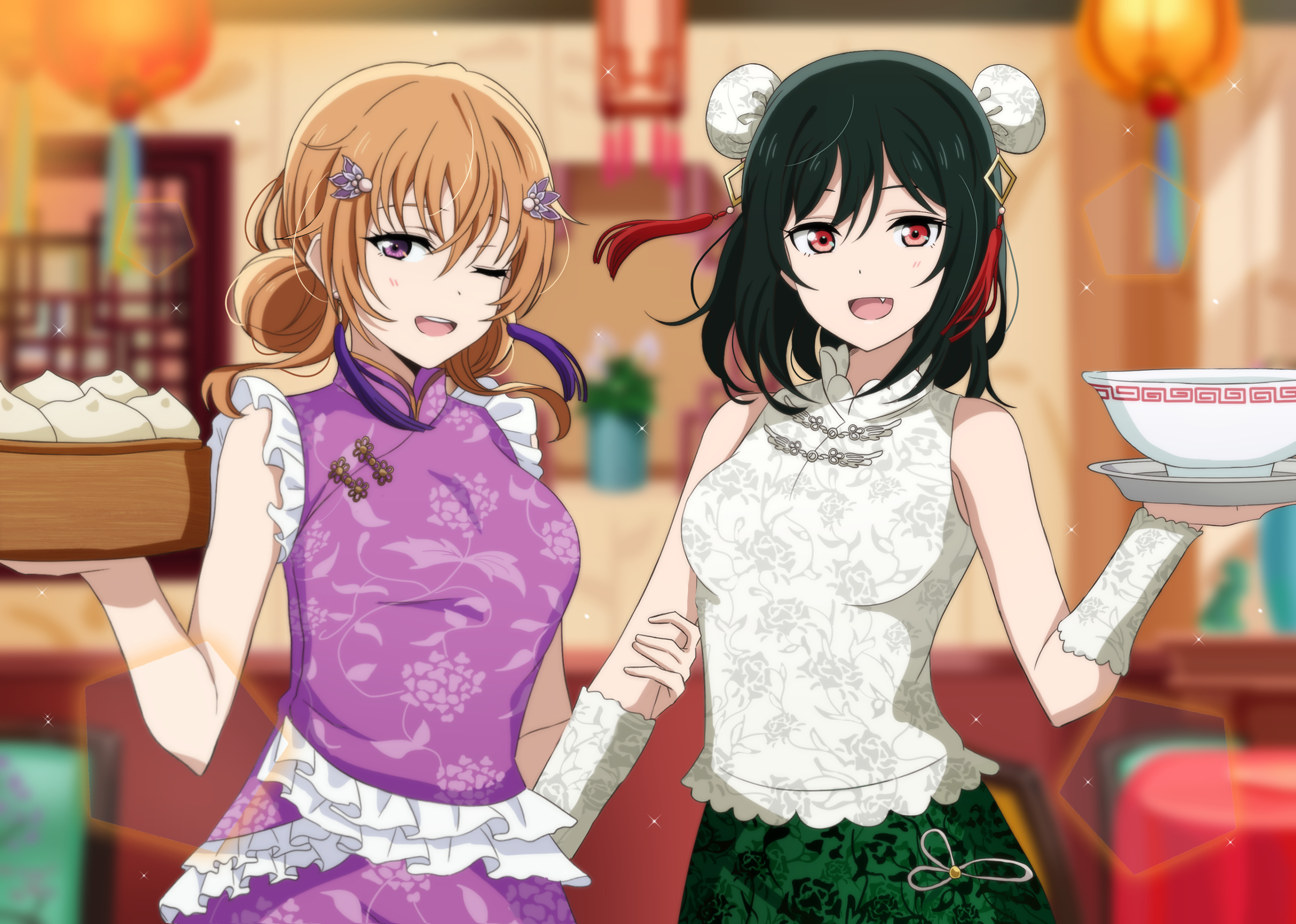 2girls alternate_costume steamed_bun bare_shoulders black_hair blurry bowl breasts chinese_clothes depth_of_field double_bun floral_print food hair_bun highres holding holding_plate indoors konoe_kanata lantern looking_at_viewer love_live! love_live!_nijigasaki_high_school_idol_club medium_breasts medium_hair mifune_shioriko multiple_girls orange_hair paper_lantern plate purple_eyes red_eyes window yumel_lot