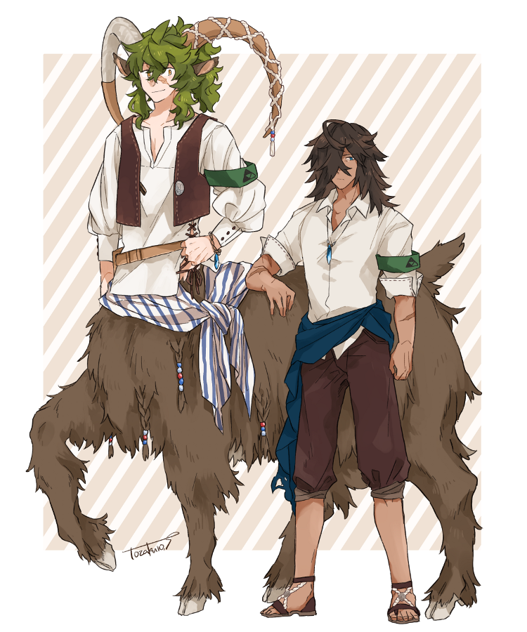 2boys animal_ears armband artist_name beads bracelet brown_hair brown_pants brown_vest centauroid dark-skinned_male dark_skin green_hair hair_beads hair_ornament hooves horn_cover jewelry long_sleeves lukas_bergamot male_focus multiple_boys necklace pants pixiv_fantasia pixiv_fantasia_last_saga sandals scar scar_on_arm scar_on_face sheep_ears shirt simple_background standing striped_background taur tozakuro_s vest white_shirt william_cedarwood