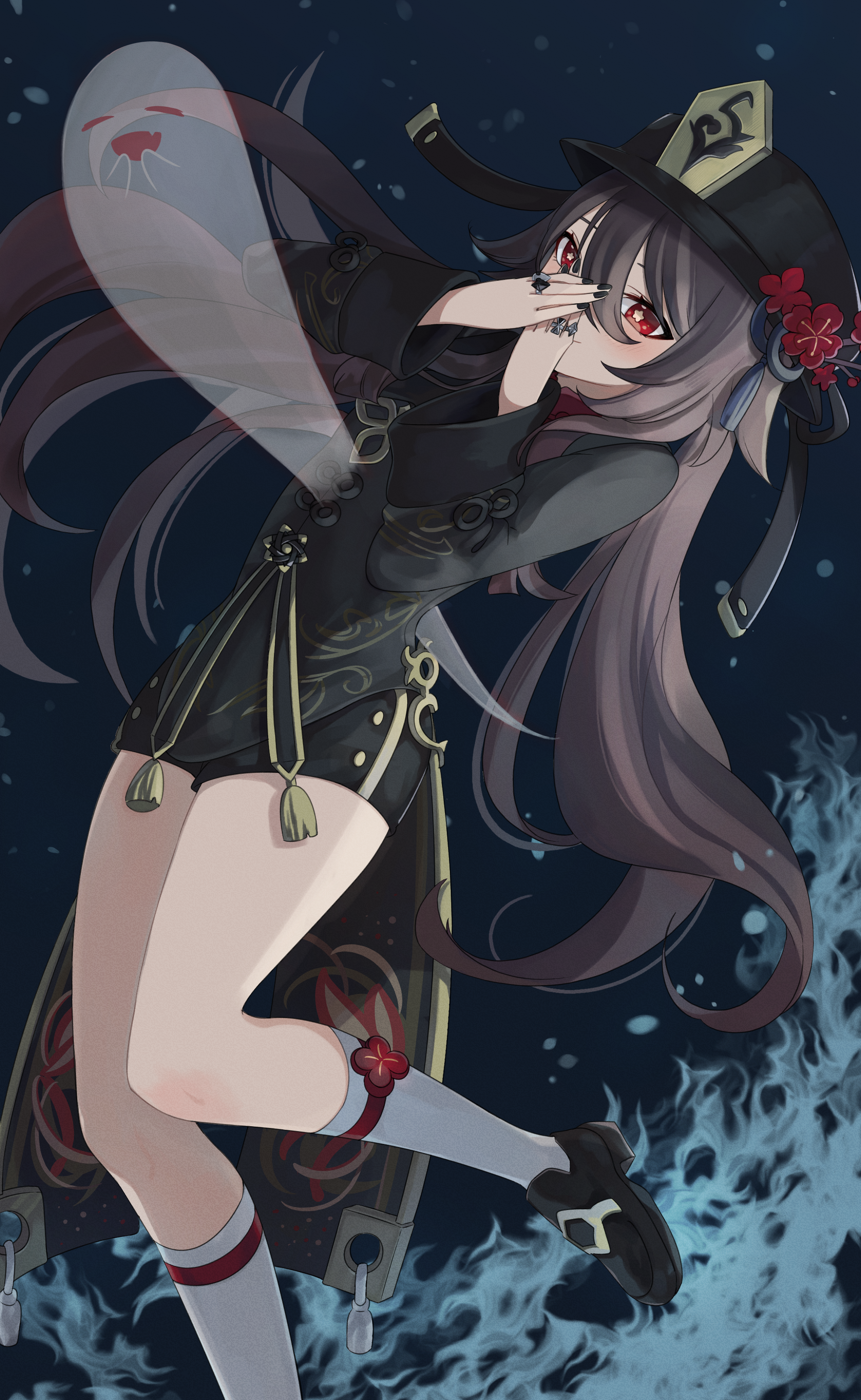 1girl absurdres black_footwear black_hat black_nails black_shorts boo_tao_(genshin_impact) brown_hair chinese_clothes coattails collared_coat covering_own_mouth engasaki_sakura flower flower-shaped_pupils genshin_impact ghost hands_up hat hat_flower highres hu_tao_(genshin_impact) jewelry multiple_rings plum_blossoms porkpie_hat red_eyes ring shorts simple_background socks solo symbol-shaped_pupils tailcoat thighs white_socks