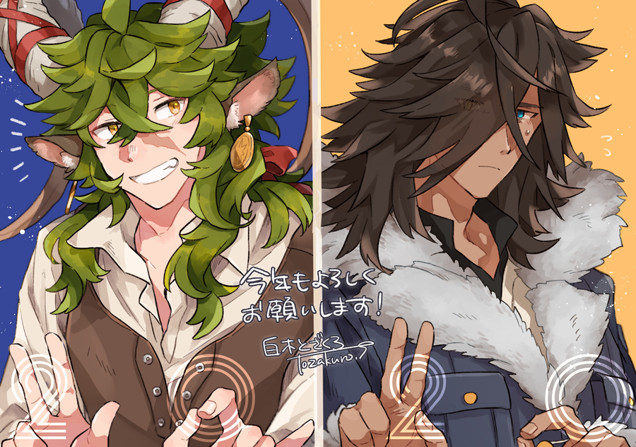 2020 2boys animal_ears artist_name blue_eyes brown_vest coat curled_horns dark-skinned_male dark_skin dated earrings frown green_hair hair_between_eyes hair_over_one_eye horn_ornament horn_ribbon horns jewelry long_hair lukas_bergamot male_focus multiple_boys pixiv_fantasia pixiv_fantasia_last_saga pocket red_ribbon ribbon sheep_ears sheep_horns shirt smile sweatdrop tozakuro_s upper_body vest white_shirt william_cedarwood yellow_eyes