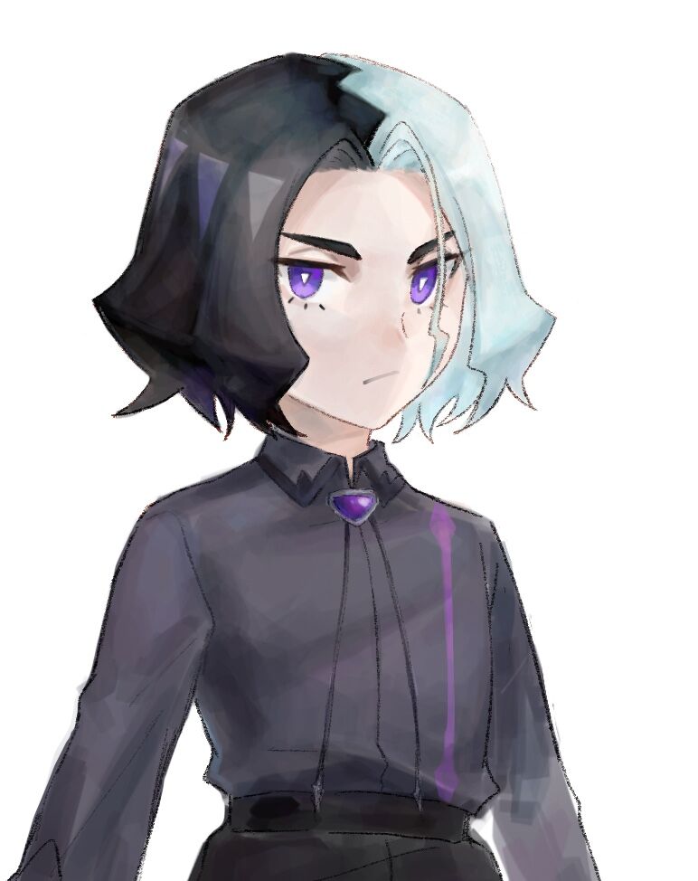 1boy amethio_(pokemon) black_pants black_ribbon bright_pupils closed_mouth collared_shirt commentary_request eyelashes grey_shirt high-waist_pants male_focus maxwell_yaochu neck_ribbon nintendo pants pokemon pokemon_(anime) pokemon_horizons purple_eyes ribbon shirt short_hair simple_background solo symbol-shaped_pupils upper_body white_background