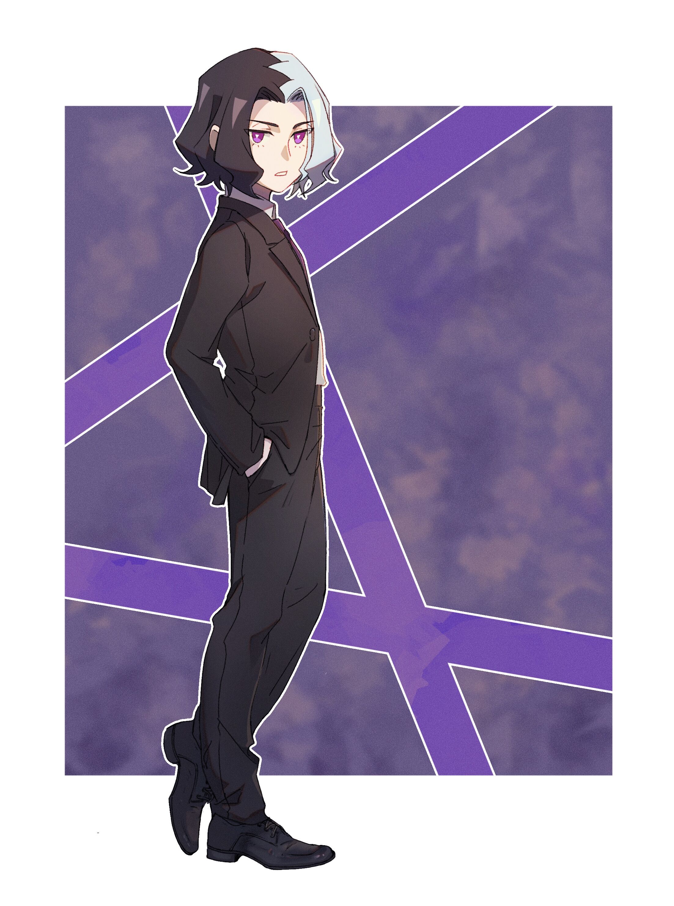 1boy absurdres amethio_(pokemon) black_jacket black_pants black_shoes border bright_pupils commentary_request from_side full_body hand_in_pocket highres jacket long_sleeves looking_to_the_side male_focus maxwell_yaochu nintendo outline pants parted_lips pokemon pokemon_(anime) pokemon_horizons purple_eyes shirt shoes short_hair solo standing white_border white_shirt