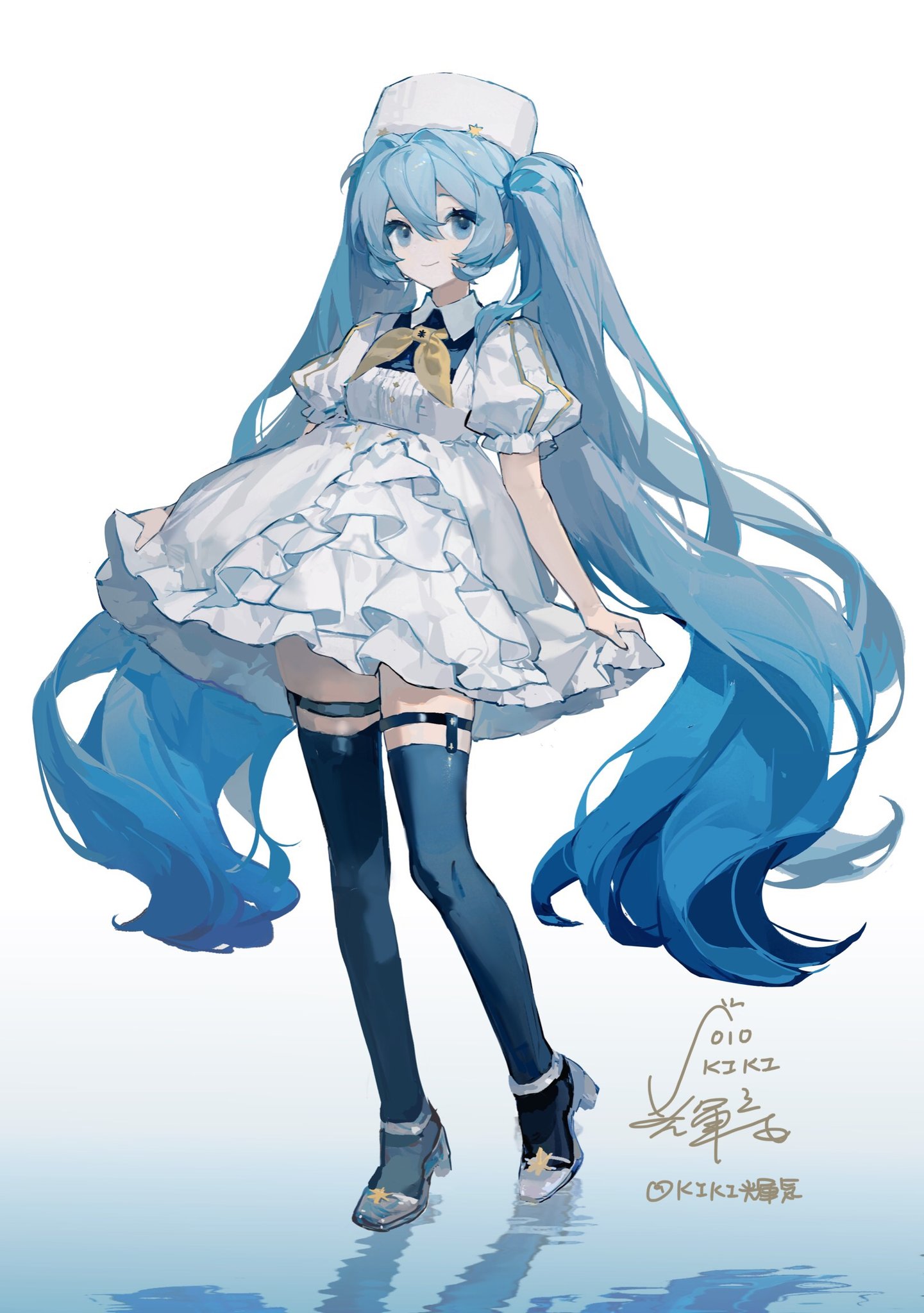 1girl black_thighhighs blue_eyes blue_hair chinese_commentary commentary_request dress frilled_dress frills fur_hat gradient_hair hair_between_eyes hat hatsune_miku highres kikihuihui legwear_garter long_hair looking_at_viewer multicolored_hair neckerchief papakha puffy_short_sleeves puffy_sleeves shoes short_sleeves sidelocks simple_background smile solo thighhighs very_long_hair vocaloid white_background white_dress white_hat white_shoes yellow_neckerchief yuki_miku yuki_miku_(2023)_(applicant)