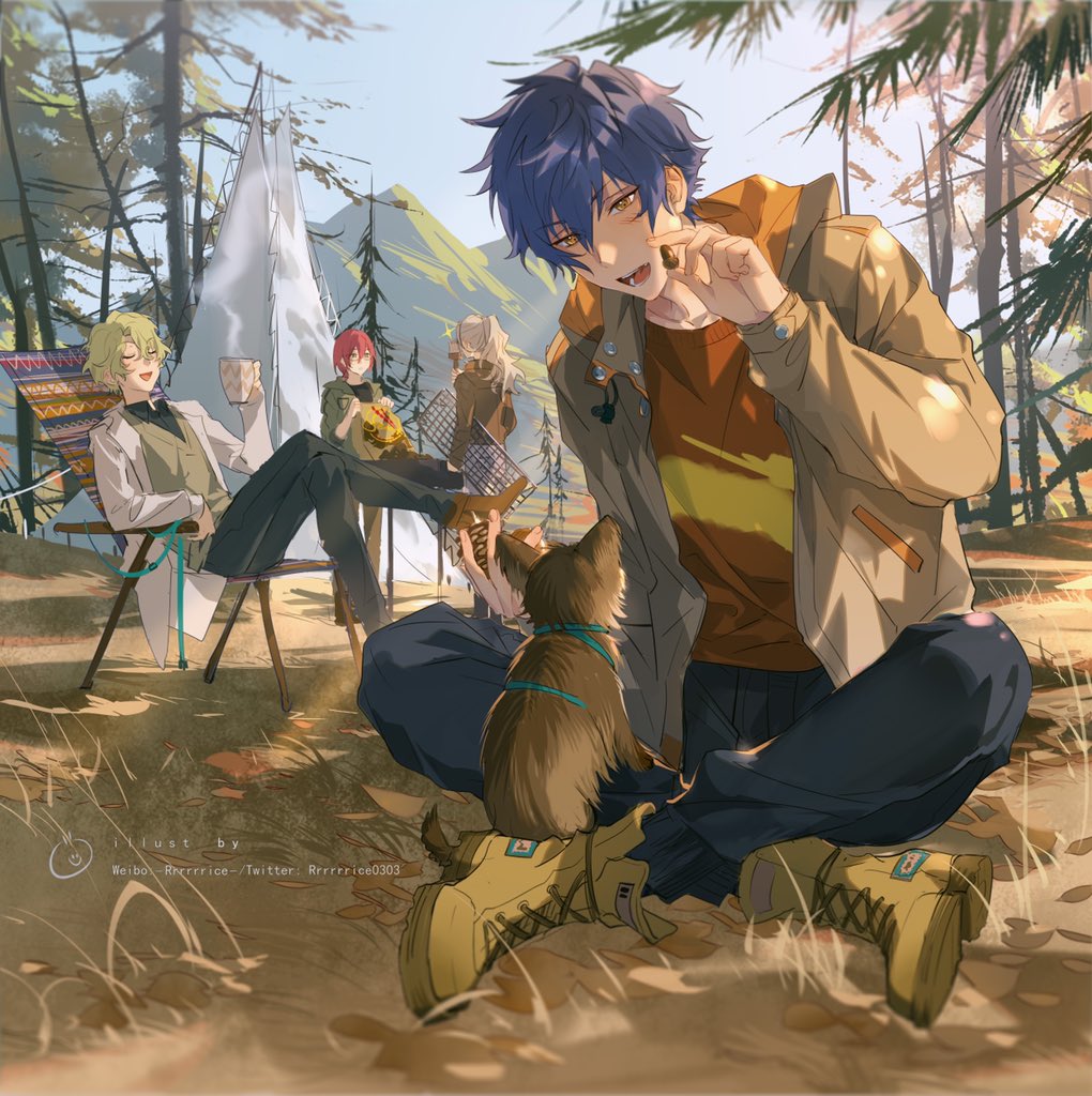 4boys blue_eyes blue_hair boots camping chair closed_mouth crossed_legs cup dark_blue_hair dog ensemble_stars! folding_chair food glasses green_hair grey_hair hair_between_eyes holding holding_cup holding_food hood hood_down long_hair long_sleeves male_focus multiple_boys open_mouth outdoors ponytail purple_hair ran_nagisa rrr_(reason) saegusa_ibara sazanami_jun shoelaces short_hair sitting teeth tomoe_hiyori tree twitter_username yellow_eyes