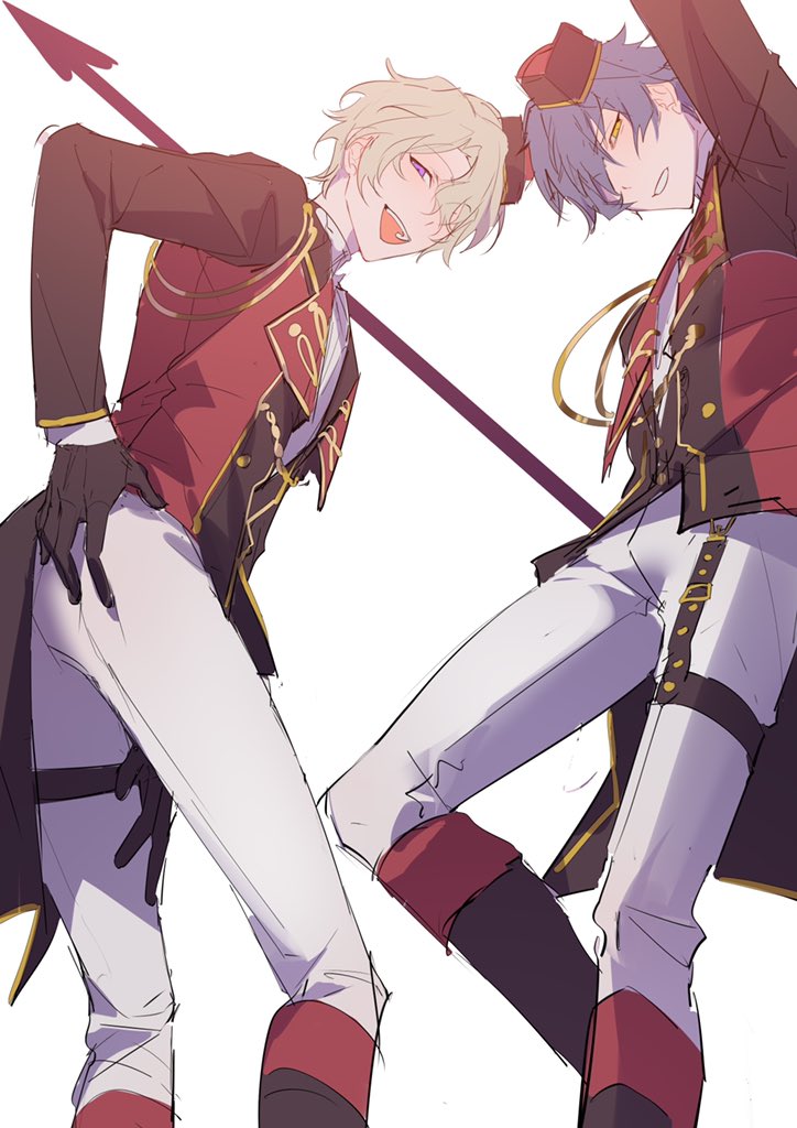 2boys black_gloves blue_hair boots chinese_commentary commentary_request ensemble_stars! from_below gloves green_hair hand_on_own_ass hand_on_own_thigh hat long_sleeves male_focus multiple_boys open_mouth pants purple_eyes rrr_(reason) sazanami_jun short_hair teeth thigh_strap tomoe_hiyori upper_teeth_only white_background white_pants yellow_eyes