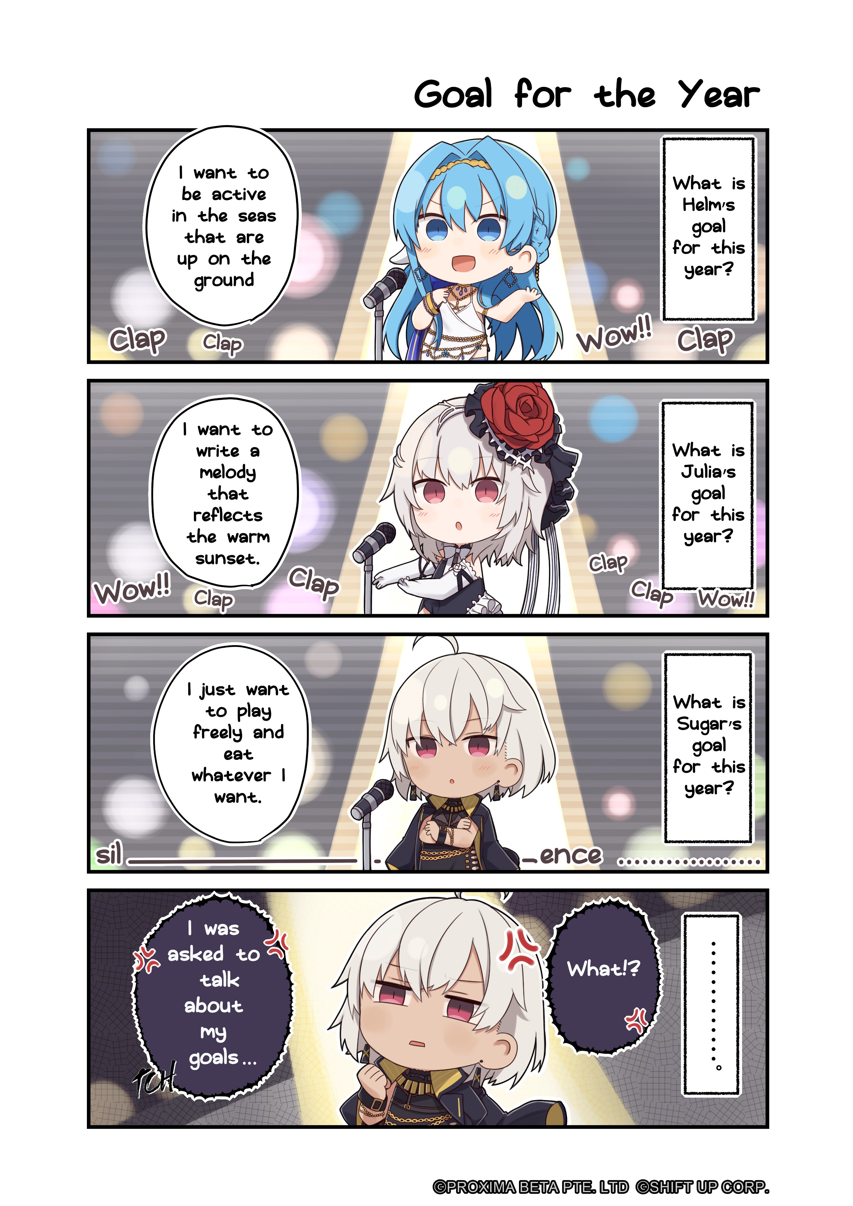 ... 3girls 4koma absurdres ahoge anger_vein angry blue_eyes braid comic commentary crossed_arms dress english_commentary english_text flower formal_clothes gloves goddess_of_victory:_nikke hair_flower hair_ornament helm_(chandelier)_(nikke) helm_(nikke) highres julia_(mild_nocturne)_(nikke) julia_(nikke) long_hair microphone microphone_stand multiple_girls red_eyes speech_bubble sugar_(hard_boiled)_(nikke) sugar_(nikke) totatokeke white_hair