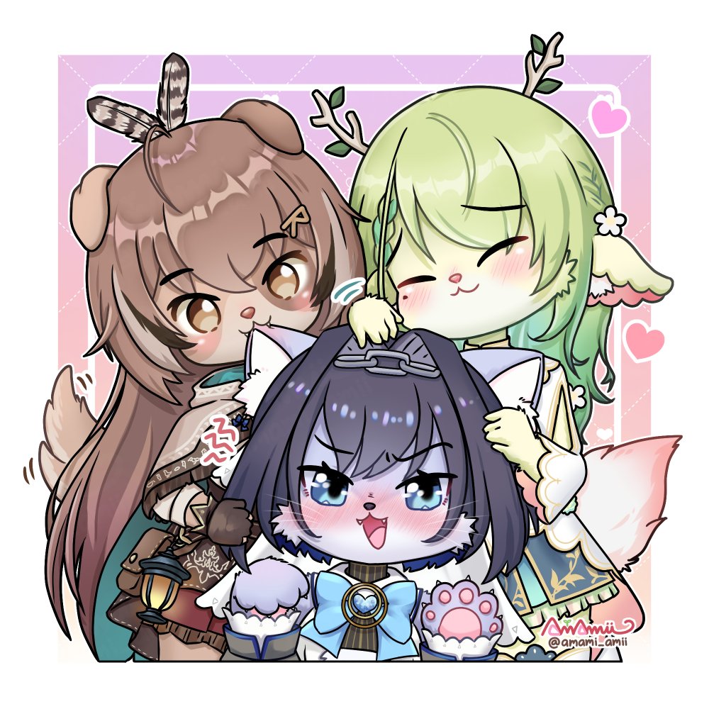 3girls amamii-amii animal_ears animal_hands biting blue_eyes blue_hair blush braid branch brown_eyes brown_hair cape cat_ears ceres_fauna ceres_fauna_(1st_costume) ceres_fauna_(jirai_kei) chibi closed_eyes dog_ears dog_tail dress biting_ear feather_hair_ornament feathers furrification furry furry_female green_hair hair_ornament heart hololive hololive_english horns hug leaf long_hair medium_hair multiple_girls nanashi_mumei nanashi_mumei_(1st_costume) ouro_kronii ouro_kronii_(1st_costume) ribbon smile snout tail virtual_youtuber