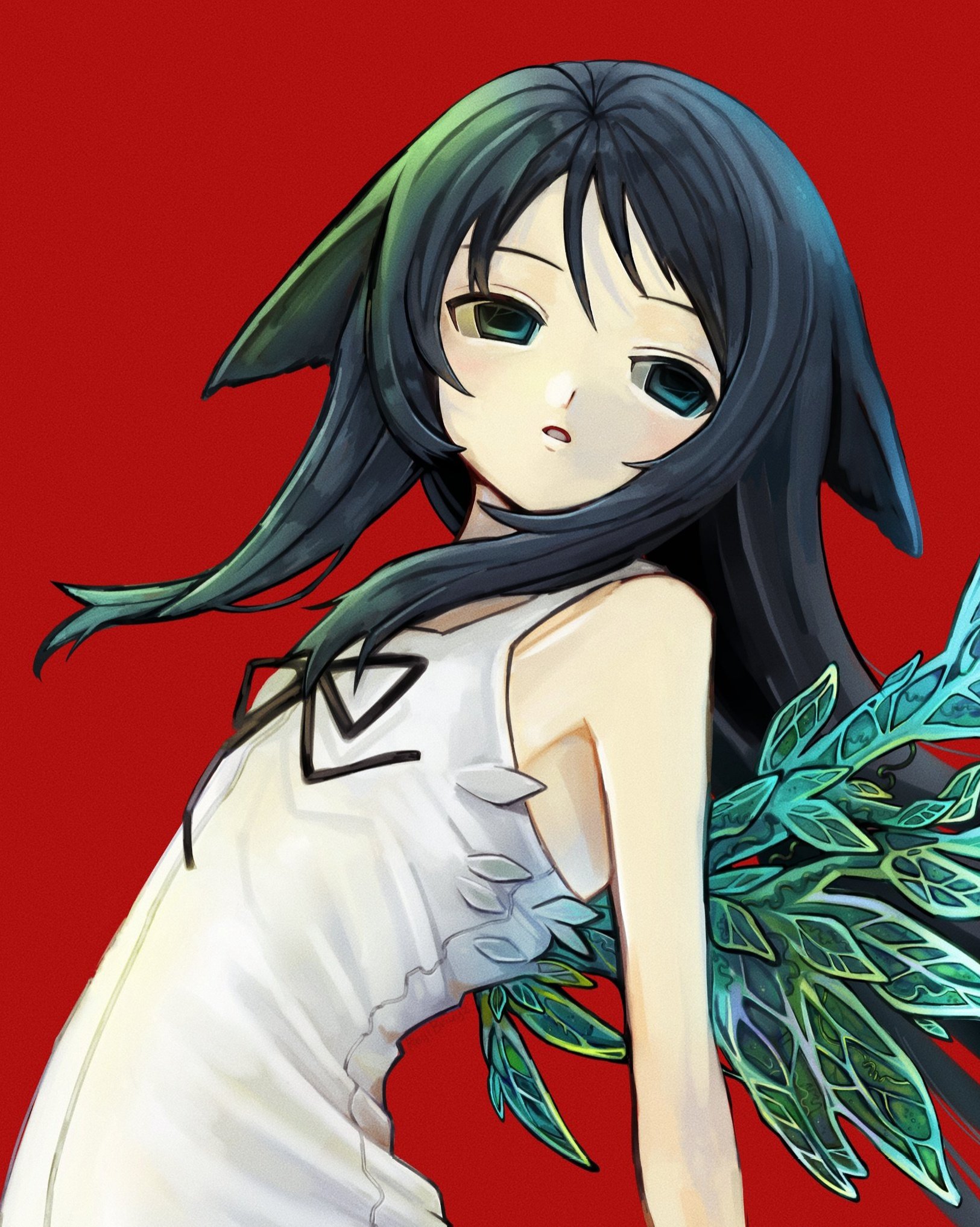 1girl bare_shoulders black_hair dress flat_chest green_eyes green_wings hair_flaps highres long_hair looking_to_the_side open_mouth r_(reijibnuy2) red_background ribbon saya_(saya_no_uta) saya_no_uta sidelocks simple_background sleeveless solo sundress upper_body white_dress wings