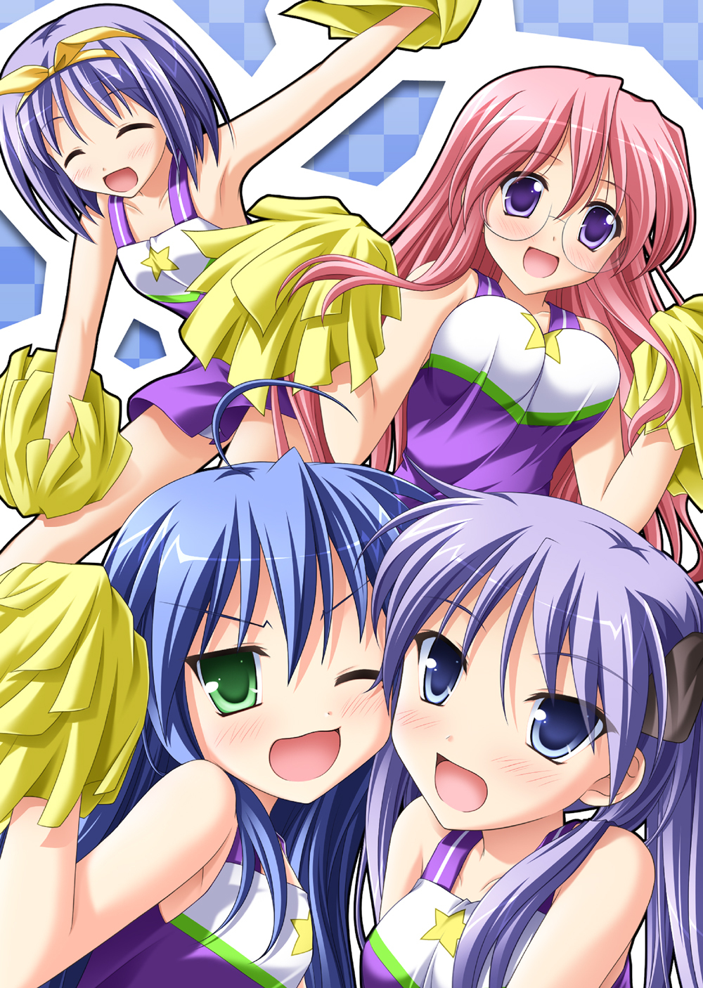 00s 4girls ahoge bad_id bad_pixiv_id blue_eyes blue_hair bouncing_breasts breasts cheerleader closed_eyes glasses green_eyes highres hiiragi_kagami hiiragi_tsukasa izumi_konata long_hair lucky_star multiple_girls one_eye_closed pink_hair pom_pom_(cheerleading) purple_eyes purple_hair short_hair siblings sisters takara_miyuki tsuda_akira twins wink yuri
