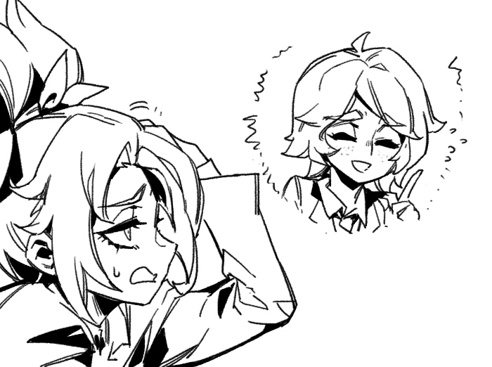 2girls :d akali arm_up flying_sweatdrops from_side greyscale hair_ribbon hand_up index_finger_raised league_of_legends long_sleeves monochrome multiple_girls open_mouth phantom_cross profile ribbon smile sweatdrop taliyah