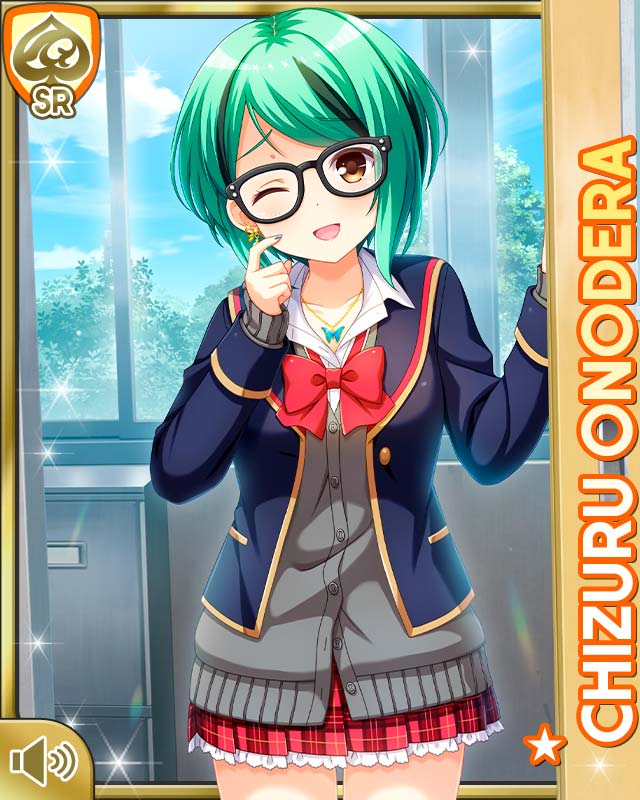 1girl black-framed_eyewear blazer blue_jacket bow bowtie brown_eyes card_(medium) day girlfriend_(kari) glasses green_hair grey_sweater hairband indoors jacket official_art one_eye_closed onodera_chizuru open_mouth plaid_clothes plaid_skirt pleated_skirt qp:flapper red_bow red_skirt school school_uniform self-portrait short_hair skirt smile socks solo sweater