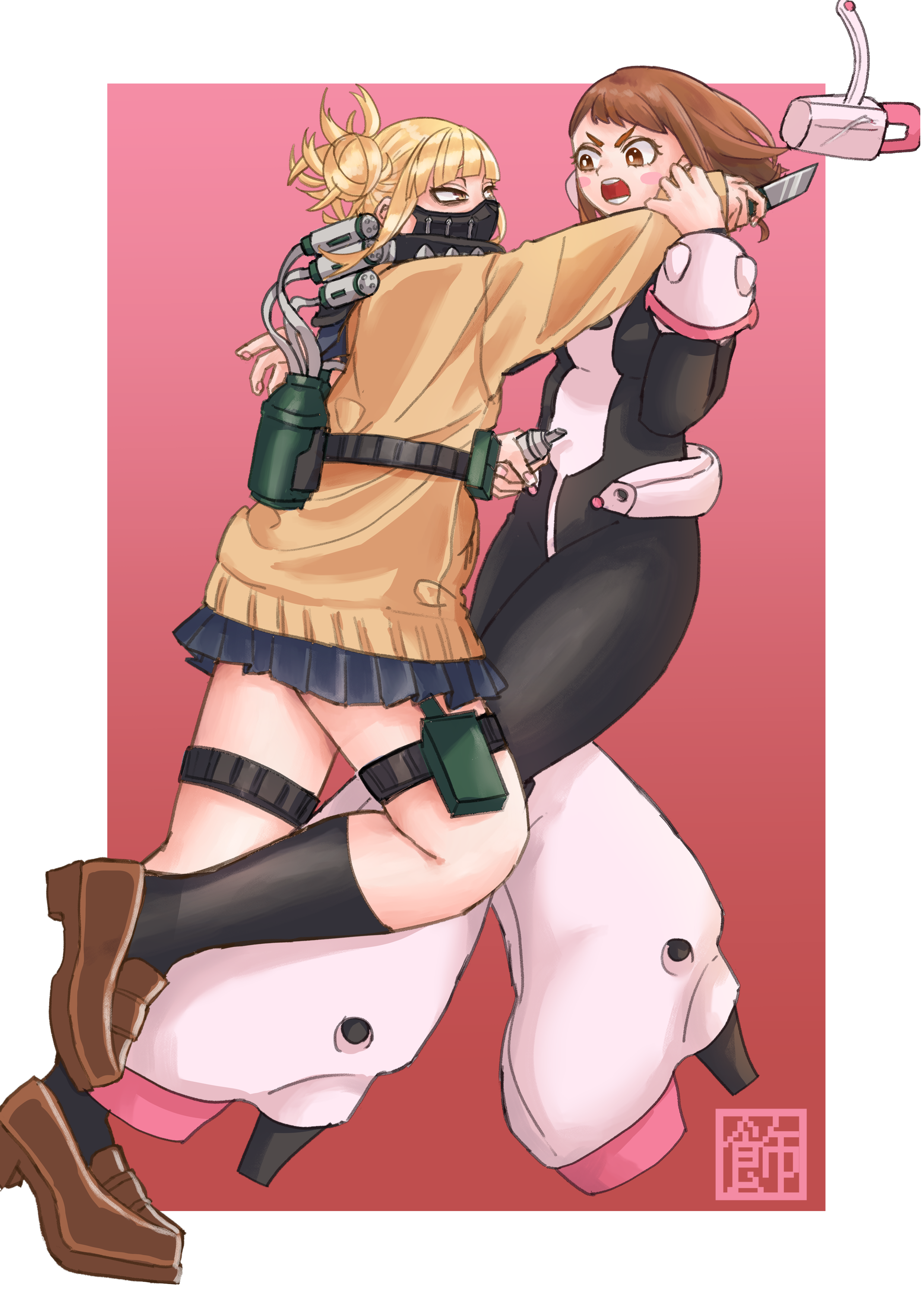 2girls absurdres belt blonde_hair blue_skirt blunt_bangs blush boku_no_hero_academia cardigan double_bun food full_body hair_bun highres holding holding_knife holding_weapon kazari_kabocya knife loafers messy_hair multiple_girls school_uniform serafuku shoes sidelocks skirt thigh_strap toga_himiko uraraka_ochako utility_belt weapon yellow_eyes