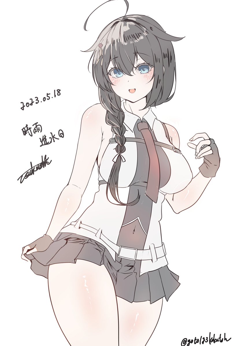 1girl ahoge black_gloves black_hair black_shirt black_skirt blue_eyes braid cowboy_shot dated fingerless_gloves gloves hair_flaps hair_over_shoulder kantai_collection kokutou_(goto123kokutoh) long_hair necktie pleated_skirt red_necktie shigure_(kancolle) shigure_kai_san_(kancolle) shirt signature single_braid skirt sleeveless sleeveless_shirt solo two-tone_shirt
