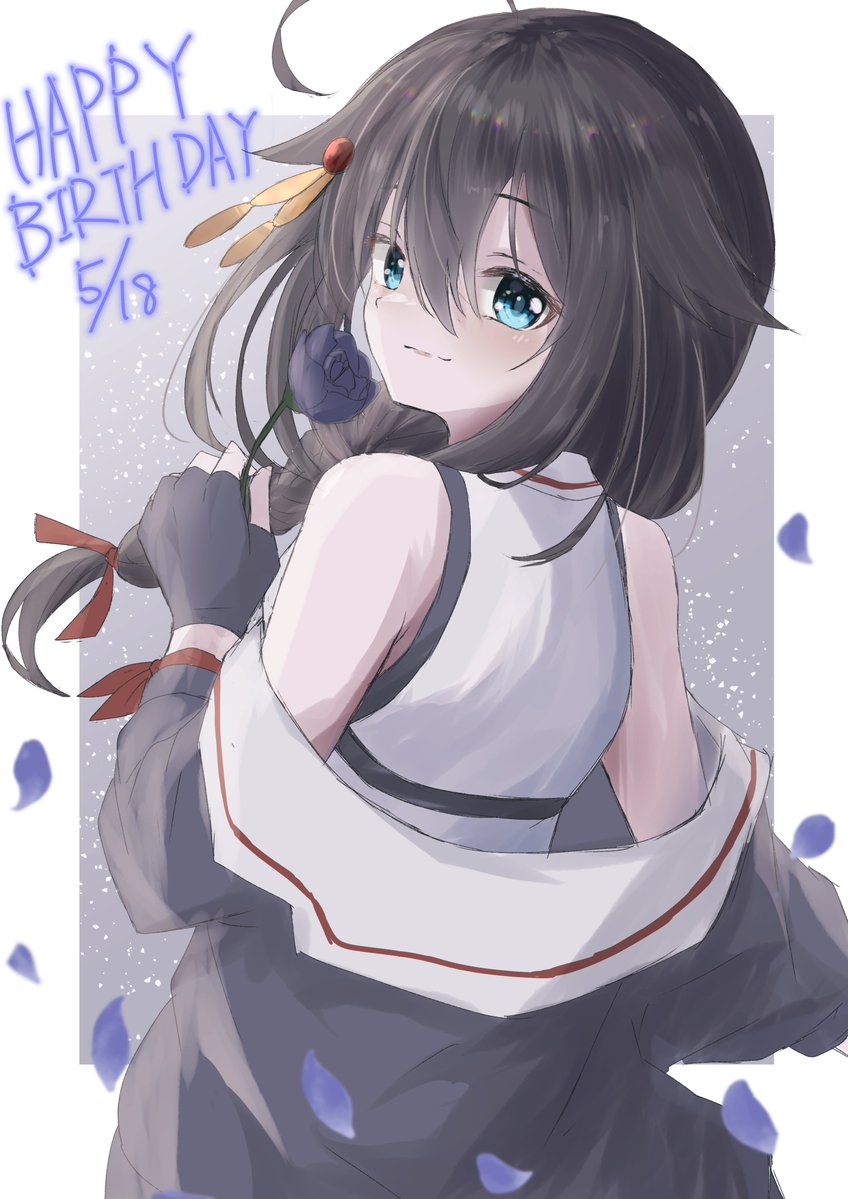 1girl ahoge black_gloves black_hair black_jacket blue_eyes braid fingerless_gloves from_behind gloves hair_flaps hair_over_shoulder happy_birthday jacket kantai_collection rafuresia_flat shigure_(kancolle) shigure_kai_san_(kancolle) shirt single_braid sleeveless sleeveless_shirt solo white_shirt