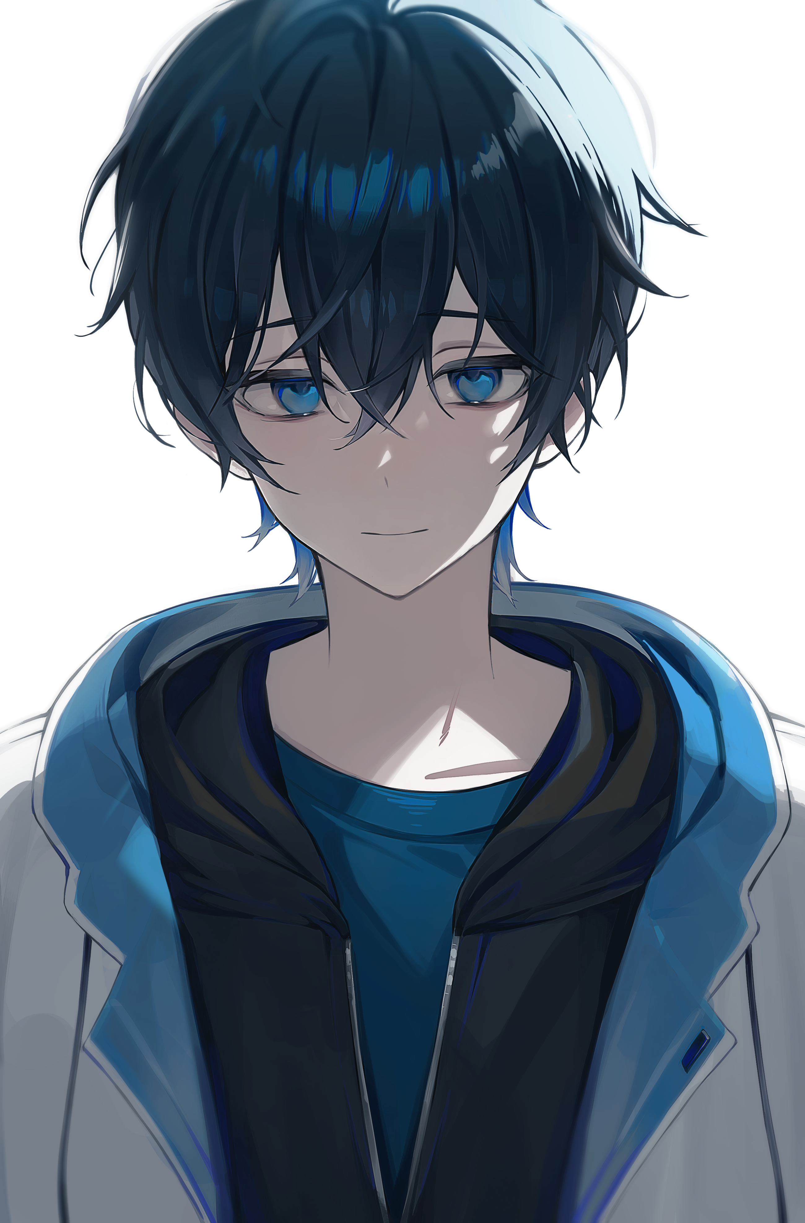 1boy :| absurdres bizette black_hair black_hoodie blue_eyes blue_shirt closed_mouth collarbone expressionless hair_between_eyes highres hood hood_down hoodie jacket layered_clothes looking_at_viewer male_focus open_clothes open_jacket original raised_eyebrows shirt short_hair sidelocks simple_background solo straight-on upper_body white_background white_jacket