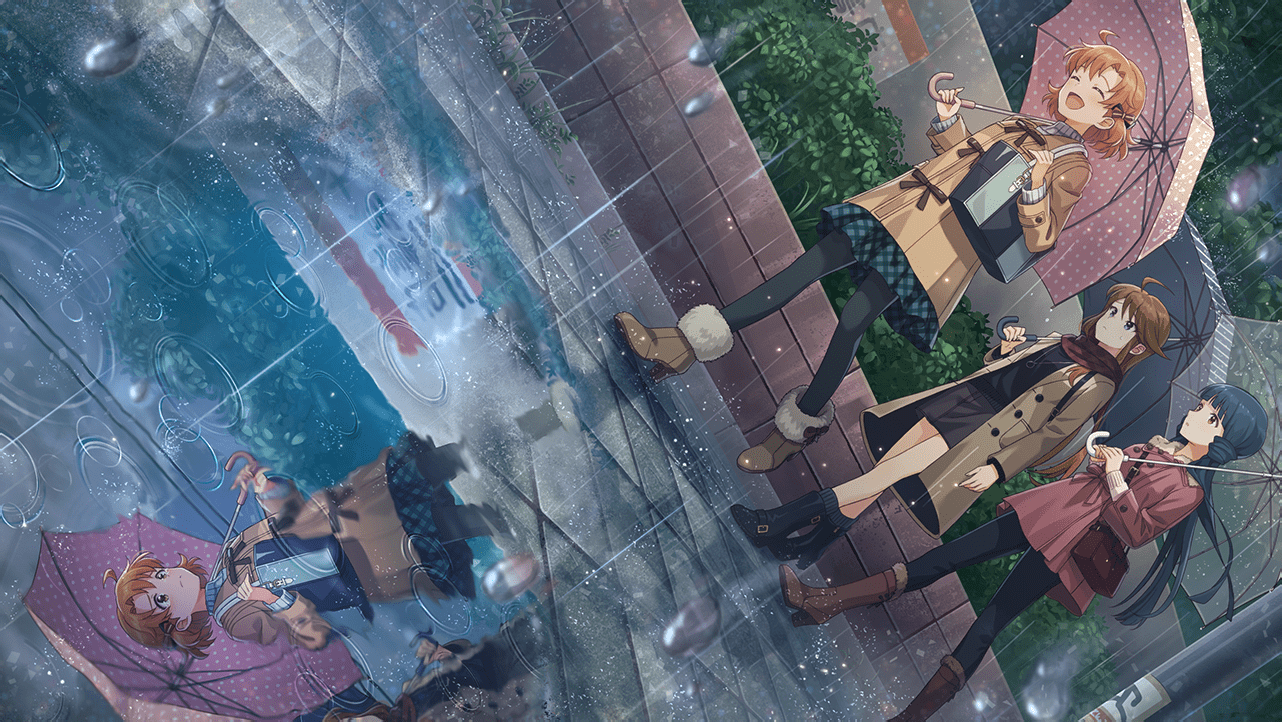 3girls boots brown_hair card_(medium) different_reflection dutch_angle frown high_heel_boots high_heels idolmaster idolmaster_million_live! idolmaster_million_live!_theater_days kitakami_reika multiple_girls official_art puddle rain reflection sad smile tokoro_megumi umbrella walking worried yabuki_kana