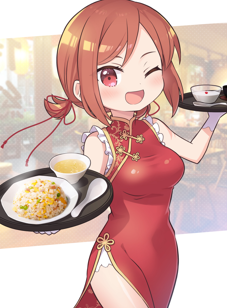 1girl a_channel alternate_costume blush breasts brown_hair china_dress chinese_clothes commission dress food fried_rice gloves holding holding_tray imai_yutaka medium_breasts one_eye_closed open_mouth red_dress red_eyes short_hair skeb_commission smile solo spoon toto_nemigi tray white_gloves
