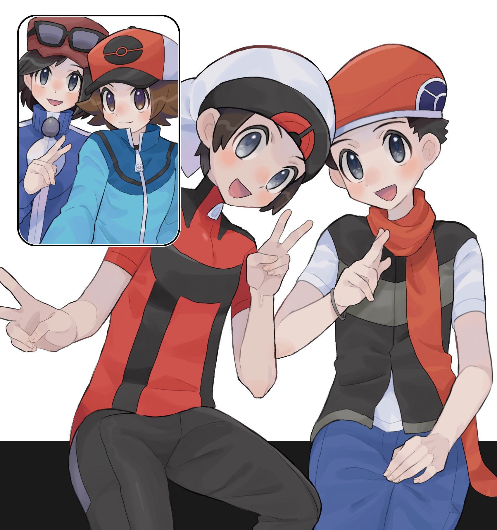 4boys :d beanie beret black_hair blue_pants bracelet brendan_(pokemon) brown_hair calem_(pokemon) commentary double_v grey_eyes hand_on_lap hand_up hat highres hilbert_(pokemon) jewelry lucas_(pokemon) male_focus multiple_boys nintendo open_mouth pants pokemon pokemon_black_and_white pokemon_diamond/pearl/platinum pokemon_omega_ruby_and_alpha_sapphire pokemon_x_and_y red_scarf sana_(37pisana) scarf shirt short_hair short_sleeves sitting smile untranslatable_commentary v vest video_call white_background white_headwear zipper_pull_tab
