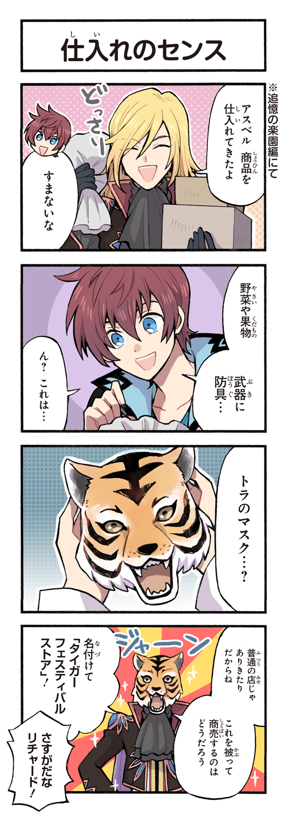 2boys 4koma asbel_lhant ascot black_ascot black_coat blonde_hair blue_eyes box brown_hair cape chibi closed_eyes coat collarbone comic furigana game_cg high_collar highres holding holding_box holding_mask holding_sack kirai_yu male_focus mask multiple_boys non-web_source official_art open_mouth richard_(tales) sack self-datamine smile sparkle tales_of_(series) tales_of_asteria tales_of_graces teeth tiger_mask_(object) translated upper_teeth_only