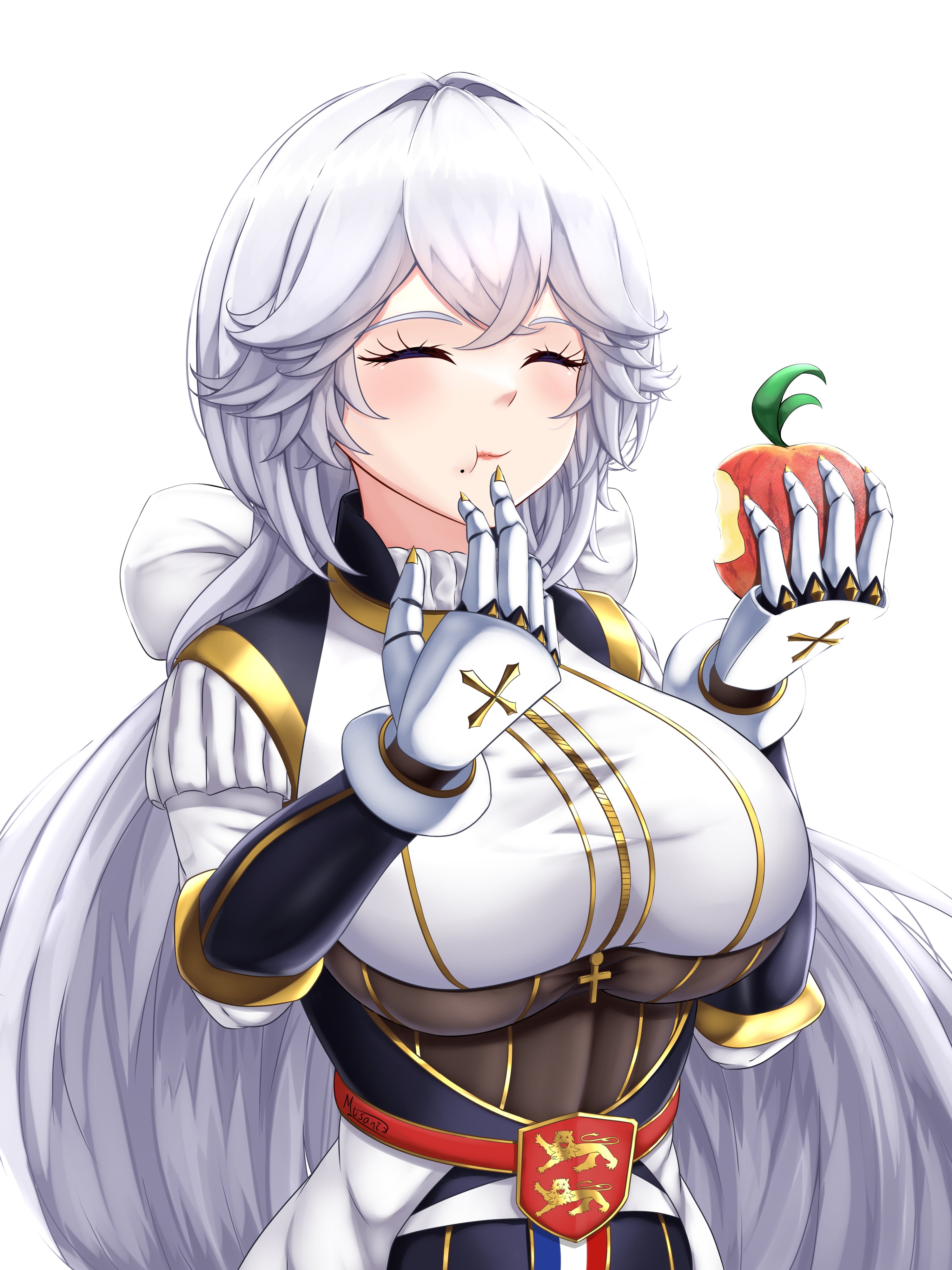 absurdres apple breasts chewing closed_eyes closed_mouth cross eating food french_flag fruit gauntlets hair_tie highres holding holding_food holding_fruit large_breasts lion long_hair musanix original white_background white_hair