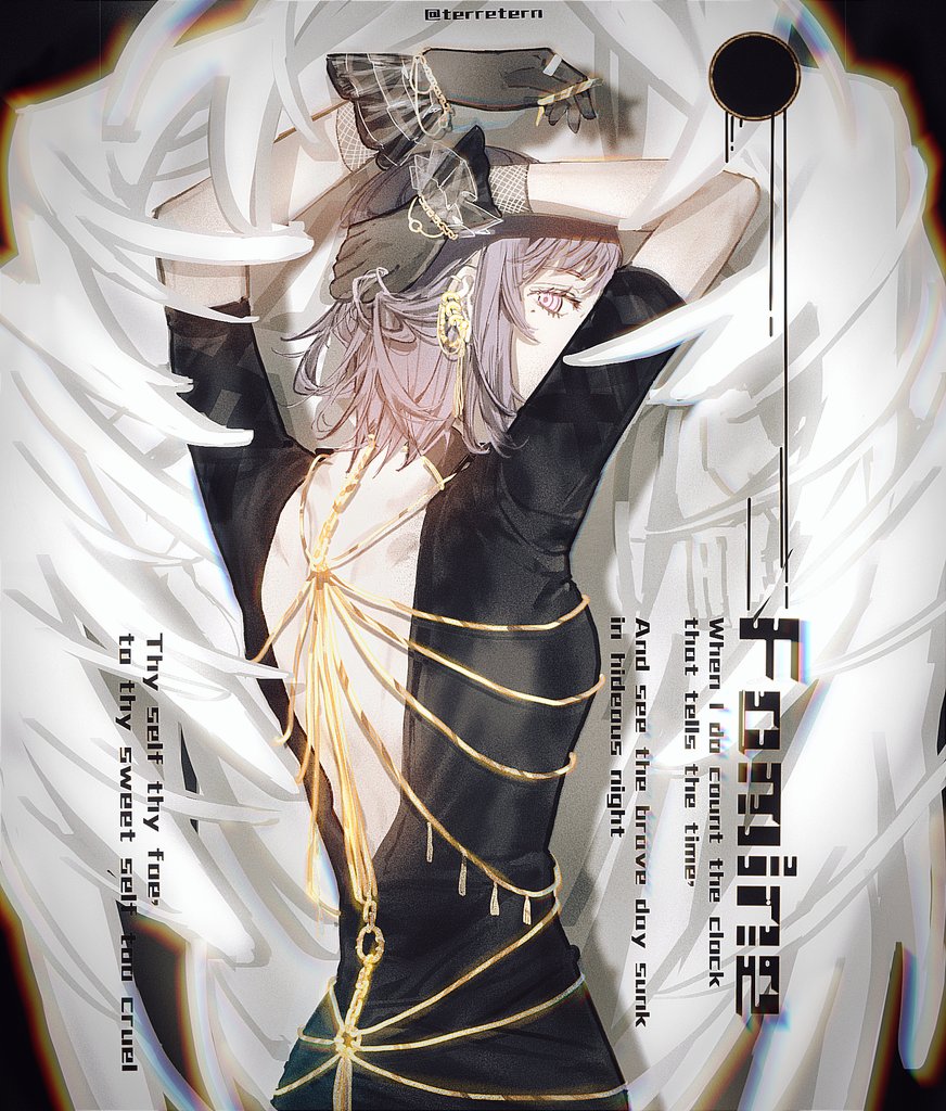 1girl arms_up backless_outfit black_dress chainsaw_man character_name dress fami_(chainsaw_man) frilled_gloves frills glitch gloves grey_eyes grey_hair looking_at_viewer looking_back mole mole_under_eye ringed_eyes short_hair solo twitter_username yijiao_wuran
