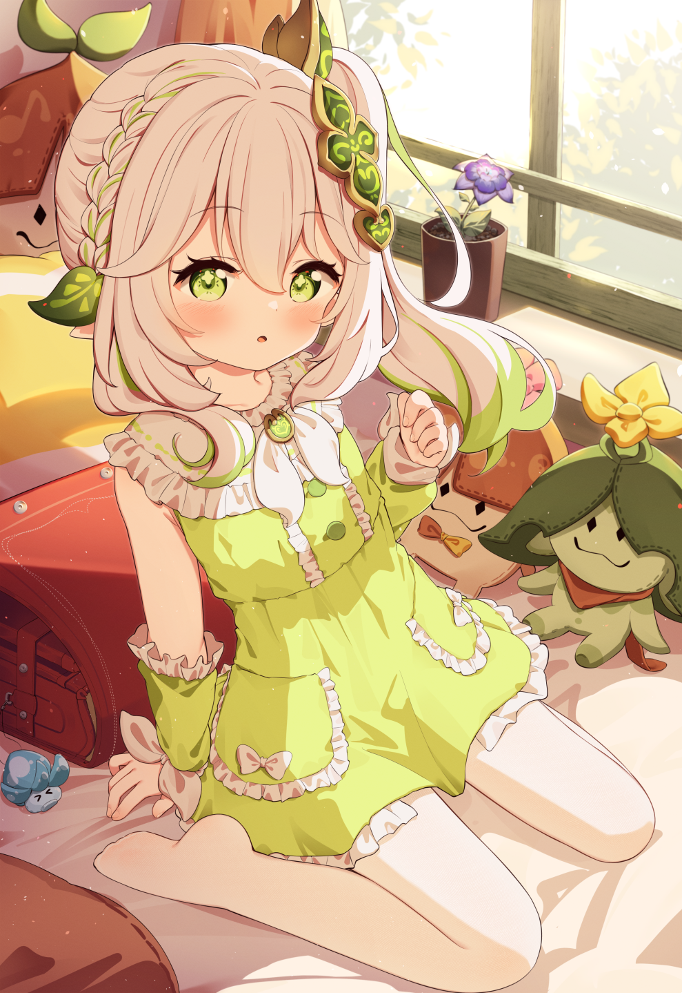 1girl alternate_costume aranara_(genshin_impact) arm_support bed bed_sheet bedroll blurry braid casual character_doll commentary_request crown_braid depth_of_field doll dress frilled_dress frills genshin_impact gradient_hair green_dress green_eyes hair_between_eyes highres indoors long_hair looking_at_viewer multicolored_hair nahida_(genshin_impact) pantyhose parted_lips pillow pointy_ears scrunchie setmen side_ponytail sidelocks single_braid sitting solo streaked_hair symbol-shaped_pupils two-tone_hair wariza white_hair white_pantyhose window wrist_scrunchie