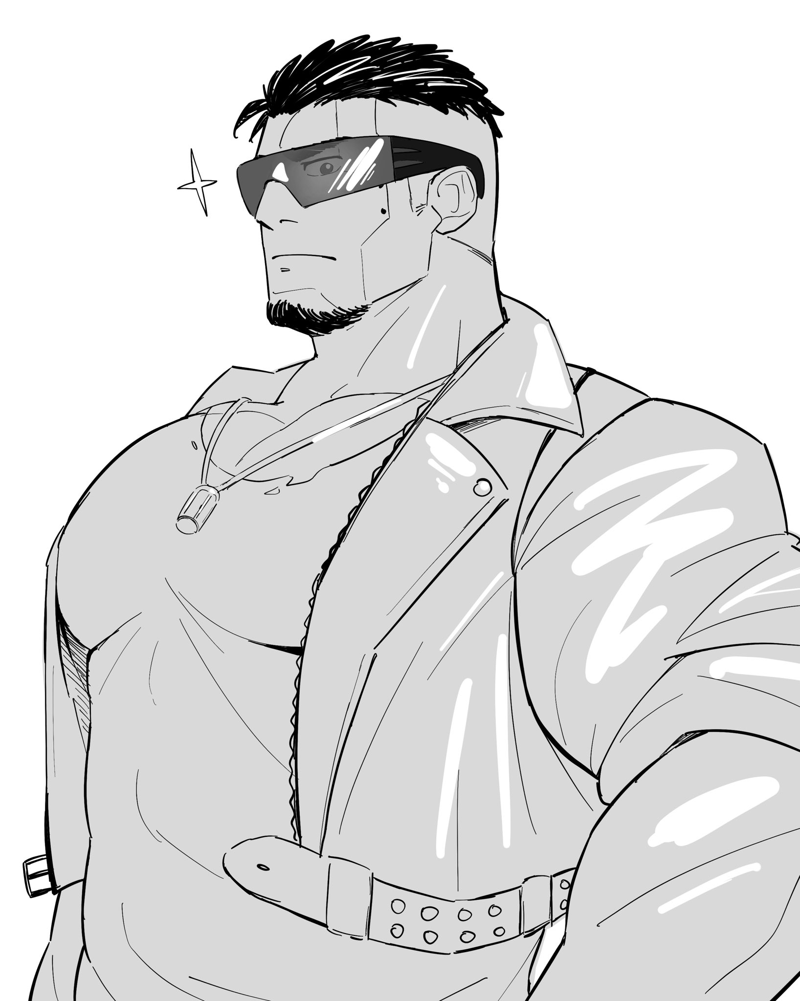1boy bara character_request cropped_jacket facial_hair from_below goatee goggles greyscale highres jacket kansuke_(kansuke_717) large_pectorals leather leather_jacket live_a_hero looking_at_viewer looking_to_the_side male_focus mature_male mole mole_under_eye monochrome muscular muscular_male pectoral_cleavage pectorals short_hair solo sparkle undercut upper_body zipper