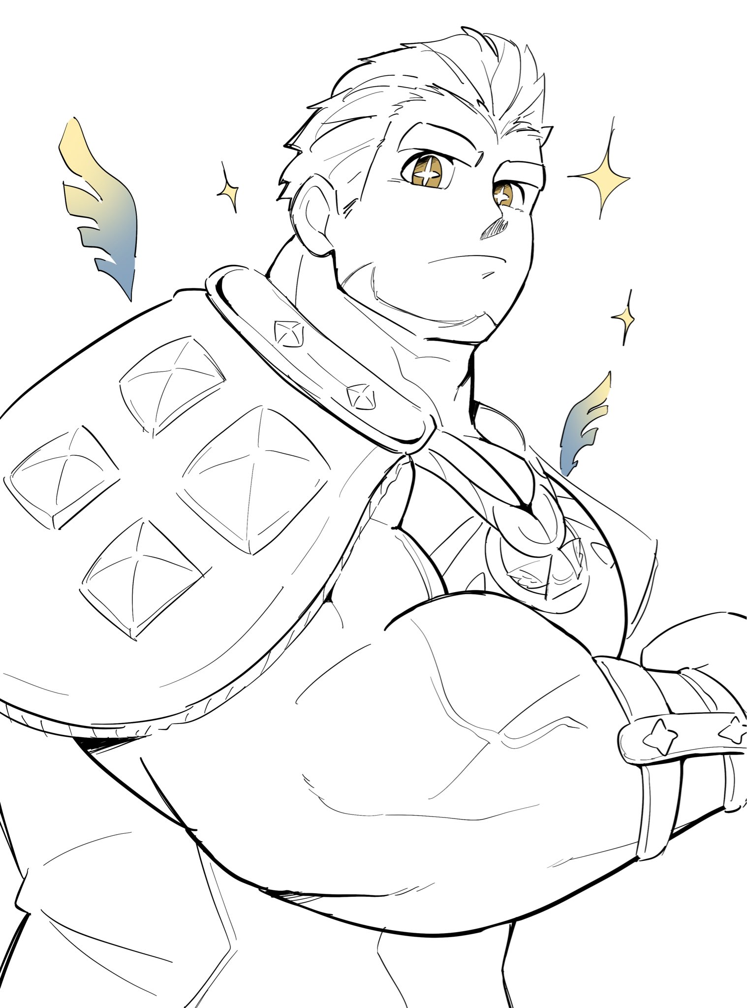 1boy ahura_mazda_(housamo) angel angel_wings bara facial_hair from_below goatee hair_slicked_back highres huge_eyebrows kansuke_(kansuke_717) large_pectorals looking_at_viewer male_focus mature_male mini_wings muscular muscular_male pectorals short_hair solo sparkle spot_color star-shaped_pupils star_(symbol) symbol-shaped_pupils tokyo_houkago_summoners upper_body veins veiny_arms wings