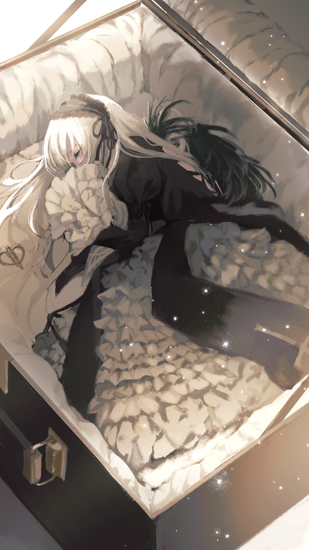 1girl bag black_dress black_hairband black_ribbon black_wings briefcase closed_eyes commentary cross cross_print dress feathered_wings frilled_dress frilled_hairband frilled_sleeves frills full_body gothic_lolita hair_ribbon hairband highres in_bag in_container juliet_sleeves layered_dress lolita_fashion lolita_hairband long_hair long_sleeves pocochino puffy_sleeves ribbon rozen_maiden sleeping solo suigintou white_dress wide_sleeves winding_key wings
