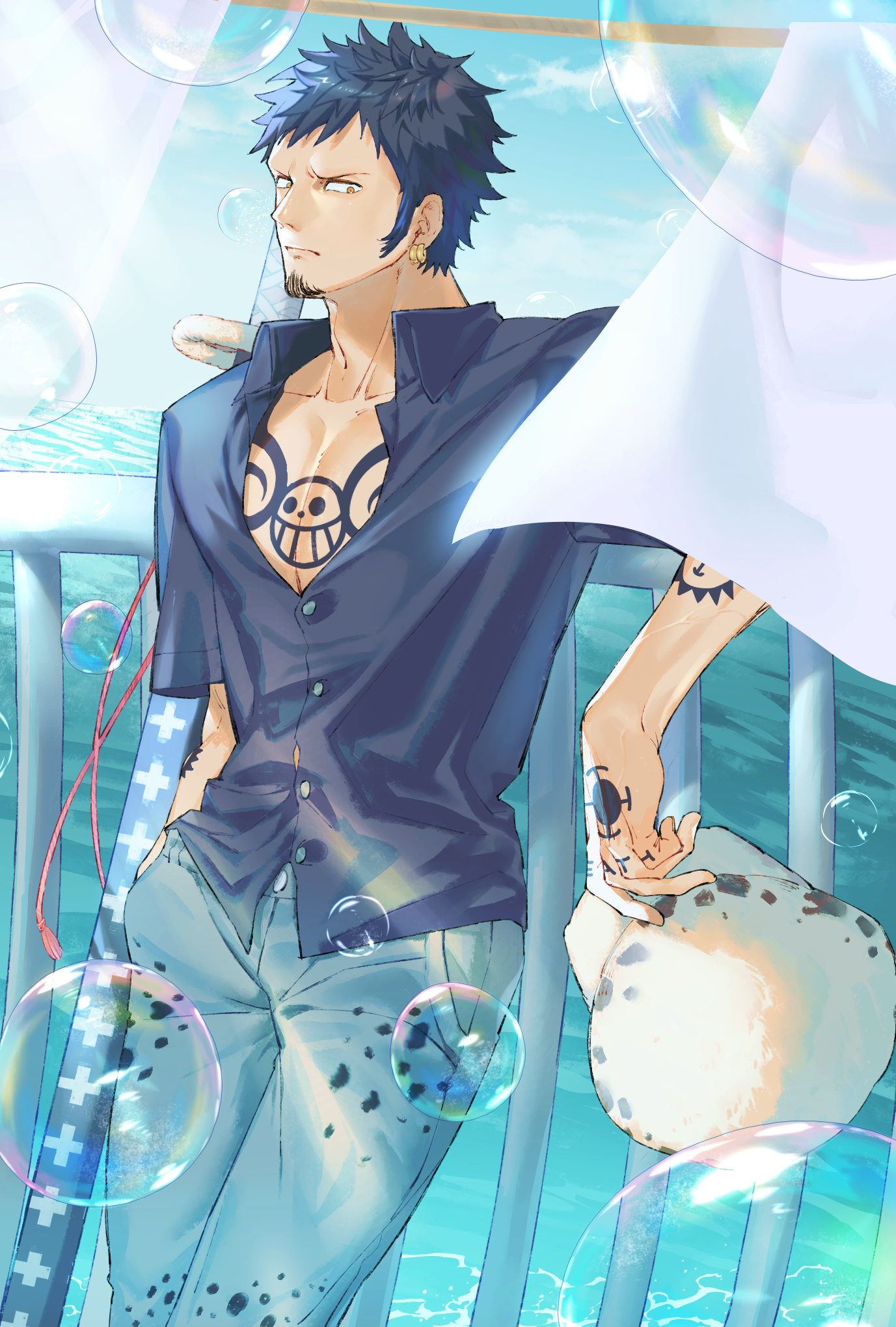 arm_tattoo blue_shirt bubble chest_tattoo collarbone collared_shirt denim earrings facial_hair finger_tattoo goatee gunjo_shizuko hand_in_pocket hand_tattoo highres leopard_print jeans jewelry long_sideburns male_focus ocean one_piece pants pectoral_cleavage pectorals sheath sheathed shirt sideburns sword tattoo trafalgar_law weapon yellow_eyes
