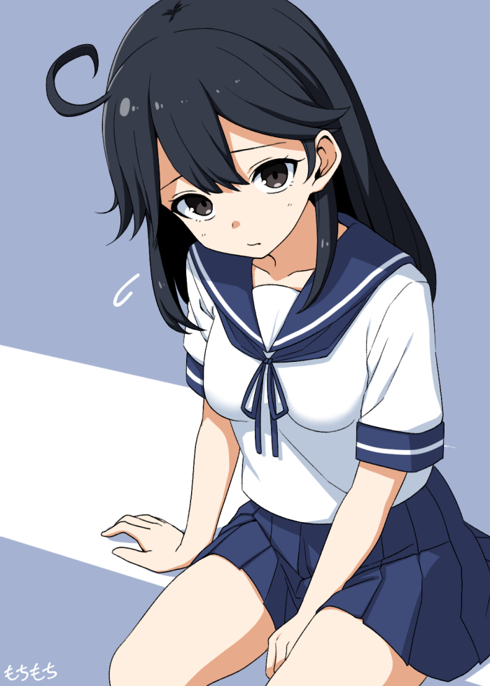 1girl ahoge black_hair blue_sailor_collar blue_skirt cowboy_shot flying_sweatdrops kantai_collection long_hair looking_at_viewer moti_coi one-hour_drawing_challenge pleated_skirt sailor_collar sailor_shirt school_uniform serafuku shirt skirt solo ushio_(kancolle) white_shirt
