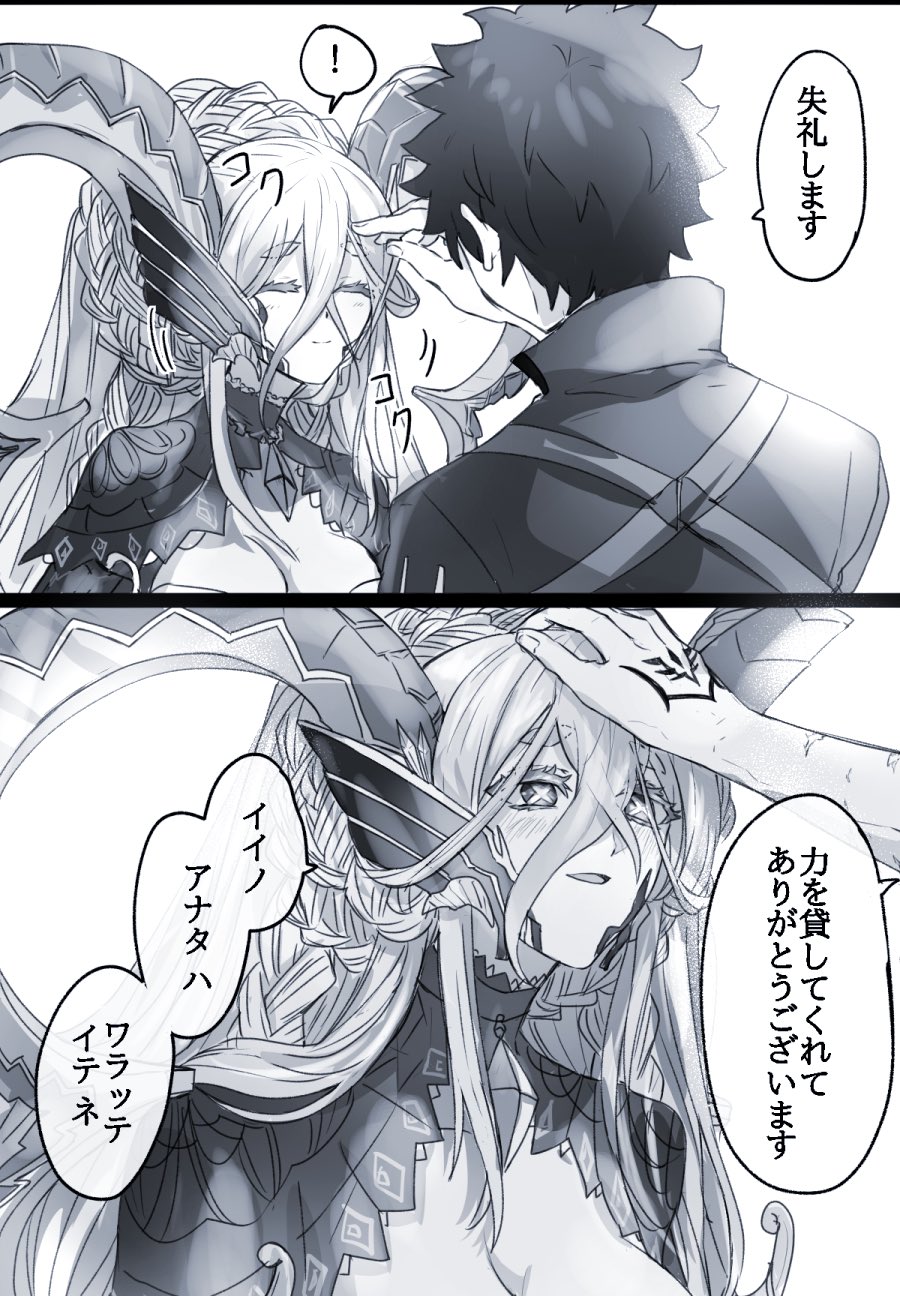 black_hair blush breasts cleavage closed_eyes closed_mouth comic cross-shaped_pupils fate/grand_order fate_(series) fujimaru_ritsuka_(male) fujimaru_ritsuka_(male)_(polar_chaldea_uniform) hand_on_another's_head headpat highres incoming_headpat large_breasts tiamat_(third_ascension)_(fate/grand_order) long_hair monochrome open_mouth short_hair short_sleeves symbol-shaped_pupils talking thick_eyebrows tiamat_(fate) tiamat_(third_ascension)_(fate/grand_order_arcade) translation_request waiting_for_headpat yukinaga_(asuten)