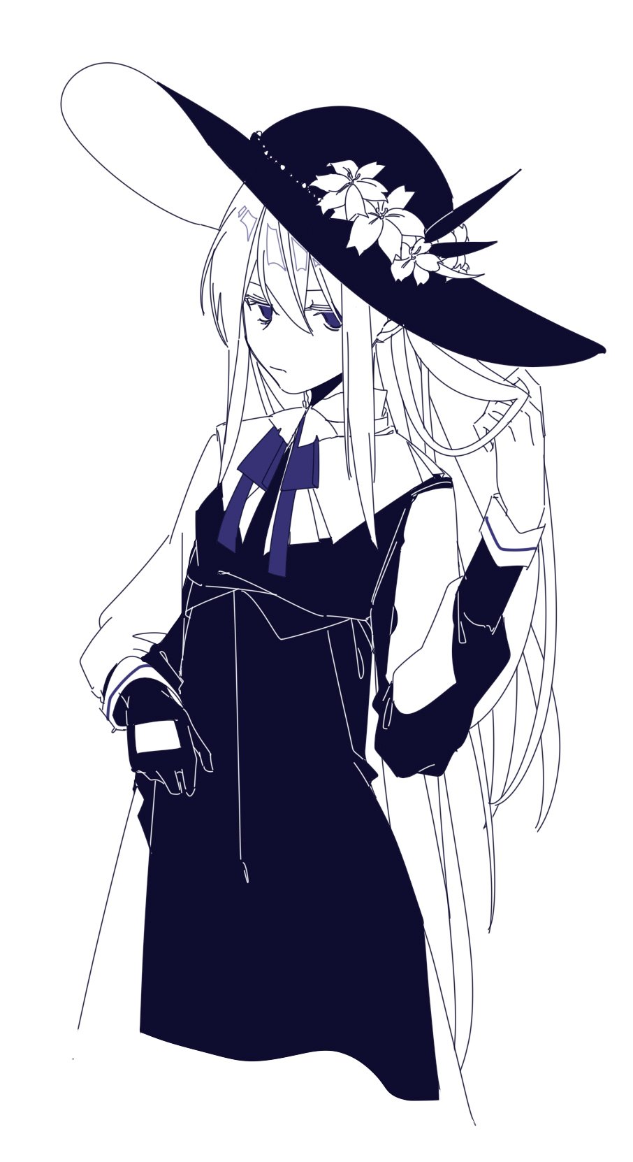 1girl black_dress black_gloves black_hat closed_mouth clothing_cutout dress empty_eyes flower glove_cutout gloves hair_between_eyes hat hat_flower highres holding holding_own_hair immiscible_discord_(project_sekai) limited_palette long_hair long_sleeves looking_at_viewer project_sekai sidelocks simple_background single_glove solo vanchvanch16 very_long_hair white_background white_flower yoisaki_kanade