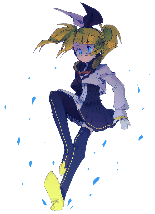 1girl arms_at_sides black_thighhighs blonde_hair blue_eyes cropped_jacket dress expressionless frilled_sleeves frills full_body hair_ornament hairclip headphones headphones_around_neck high_heels jacket kagamine_rin kagamine_rin_(reactor) looking_down lowres malan multicolored_jacket pleated_dress project_diva_(series) roshin_yuukai_(vocaloid) shoe_soles simple_background solo striped_clothes striped_thighhighs swept_bangs tagme thighhighs twintails two-tone_bow two-tone_dress two-tone_jacket vertical-striped_clothes vertical-striped_thighhighs vocaloid white_background yellow_trim zettai_ryouiki