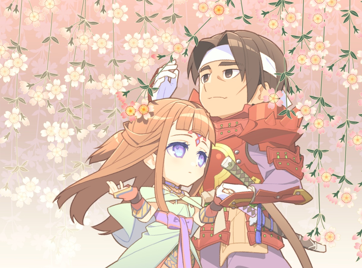 1girl armor blue_eyes blunt_bangs brown_eyes brown_hair cherry_blossoms chibi closed_mouth headband hetero holding_hands japanese_armor japanese_clothes light_smile long_hair looking_afar out_of_frame parted_bangs red_armor samurai sheath sheathed shiho_(valkyrie_profile) suo_(valkyrie_profile) sword valkyrie_profile_(series) valkyrie_profile_1 weapon white_headband yunde_(twez3727)