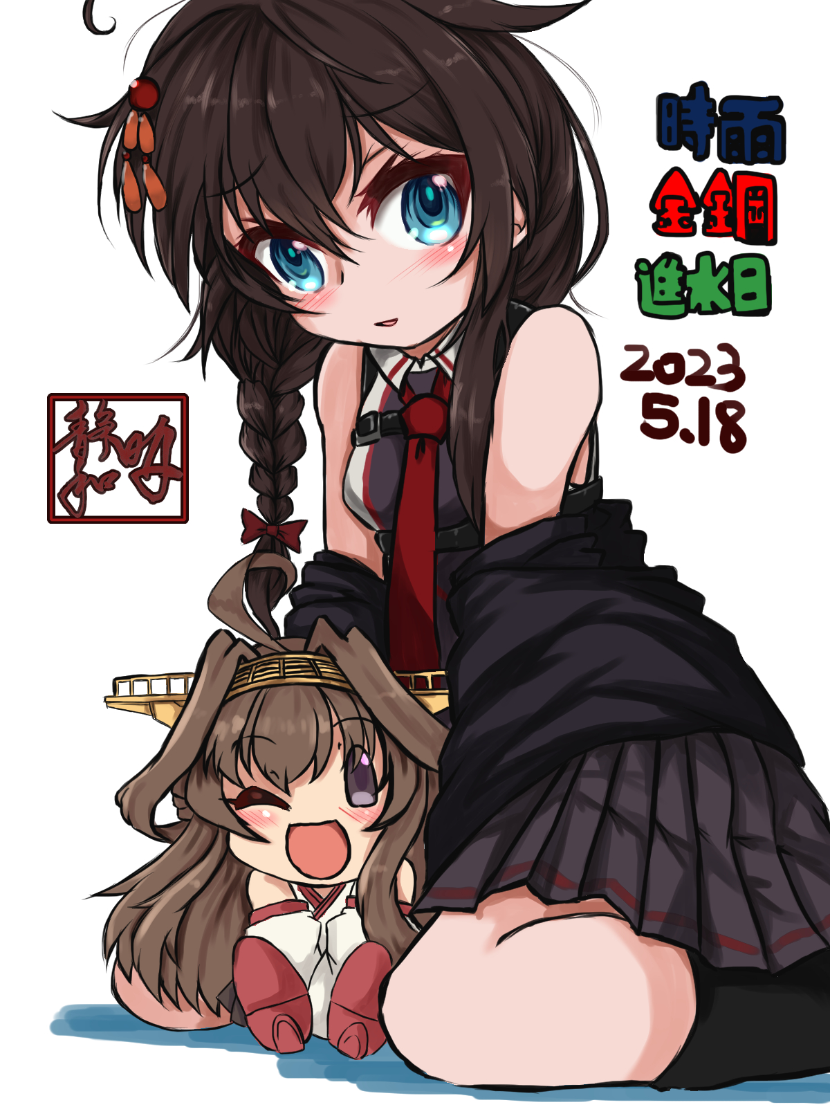 ahoge artist_logo black_gloves black_hair black_jacket black_shirt black_skirt blue_eyes braid chibi dated fingerless_gloves gloves hair_flaps hair_over_shoulder headgear highres jacket kantai_collection kongou_(kancolle) logo long_hair looking_at_viewer mini_person minigirl necktie one_eye_closed pleated_skirt red_necktie shigure_(kancolle) shigure_kai_san_(kancolle) shirt shizuwa_akira single_braid skirt sleeveless sleeveless_shirt smile two-tone_shirt