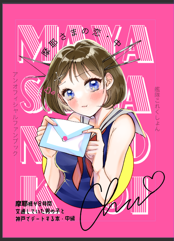blue_eyes blue_shirt brown_hair character_name commentary_request envelope hair_ornament headgear holding joi_kun_(senzai_hiyori) kantai_collection maya_(kancolle) neckerchief pink_background red_neckerchief sailor_collar sailor_shirt shirt short_hair signature translation_request upper_body white_sailor_collar x_hair_ornament