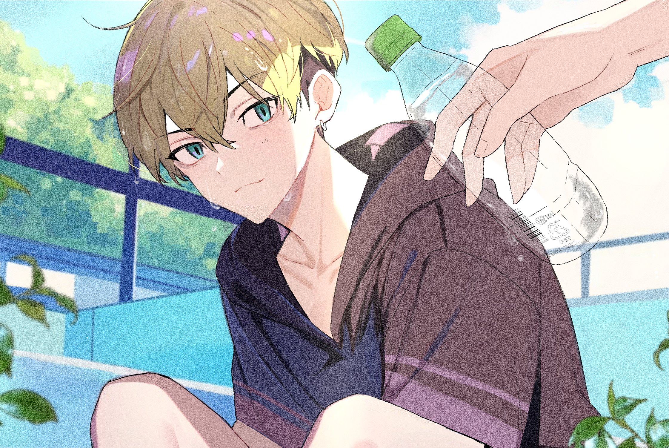 1boy 1other black_hair black_jacket blonde_hair blue_eyes bottle closed_mouth day earrings highres holding holding_bottle hood hood_down hoodie jacket jewelry knees_up male_focus matsuno_chifuyu outdoors short_hair single_earring smile sweat tokyo_revengers tottiriti undercut upper_body