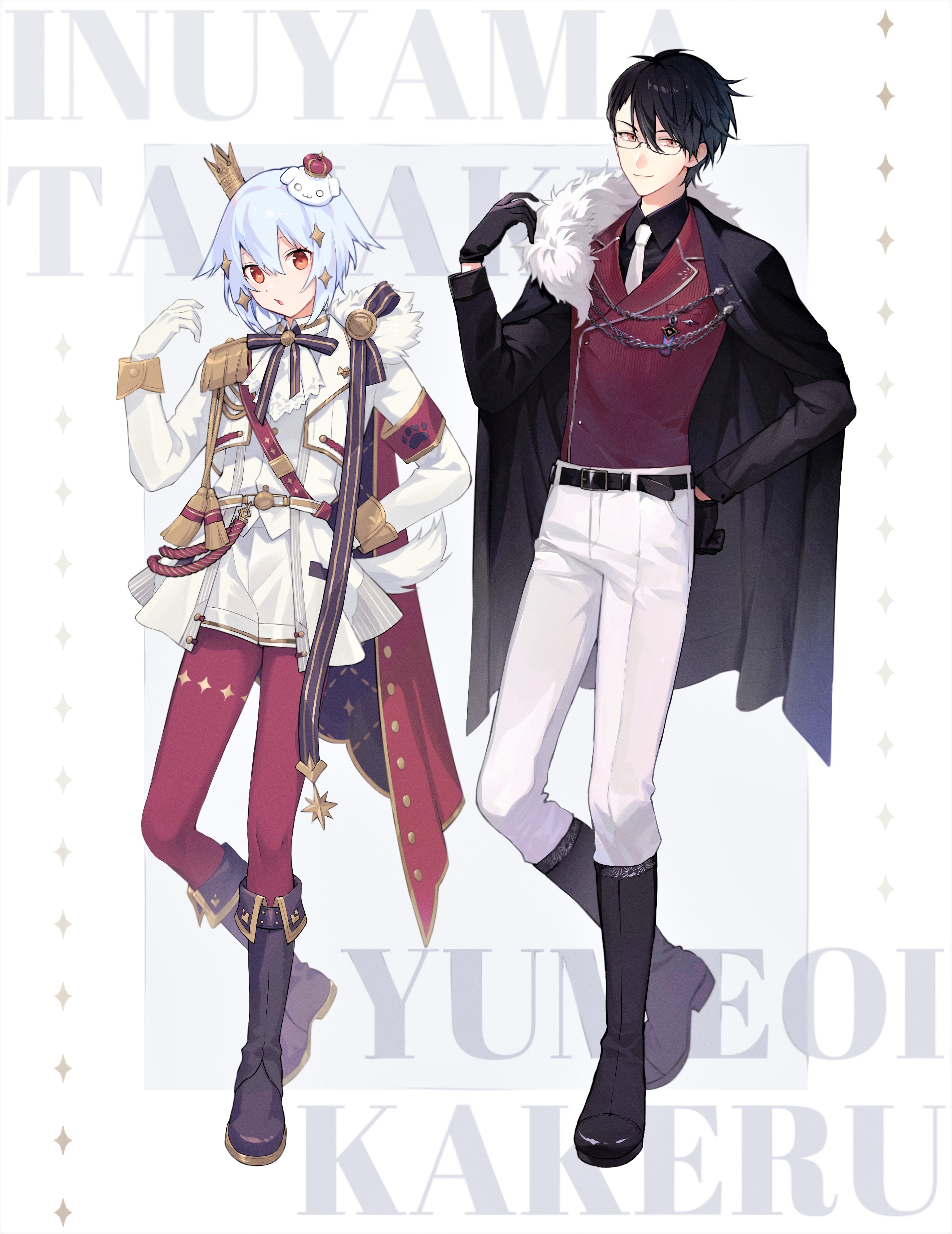 2boys absurdres armband belt black-framed_eyewear black_belt black_footwear black_gloves black_hair black_shirt blue_hair cape character_name collared_shirt crown fold-over_boots full_body fur-trimmed_cape fur_trim glasses gloves hair_between_eyes hair_ornament hand_on_own_hip hand_up highres inuyama_tamaki iv_4t long_sleeves mini_crown multiple_boys neck_ribbon necktie nijisanji noripro orange_eyes pants pantyhose paw_print red_armband red_eyes red_pantyhose red_vest ribbon shirt short_hair short_shorts shorts vest virtual_youtuber white_background white_gloves white_necktie white_pants white_shirt white_shorts yumeoi_kakeru yumeoi_kakeru_(3rd_costume)