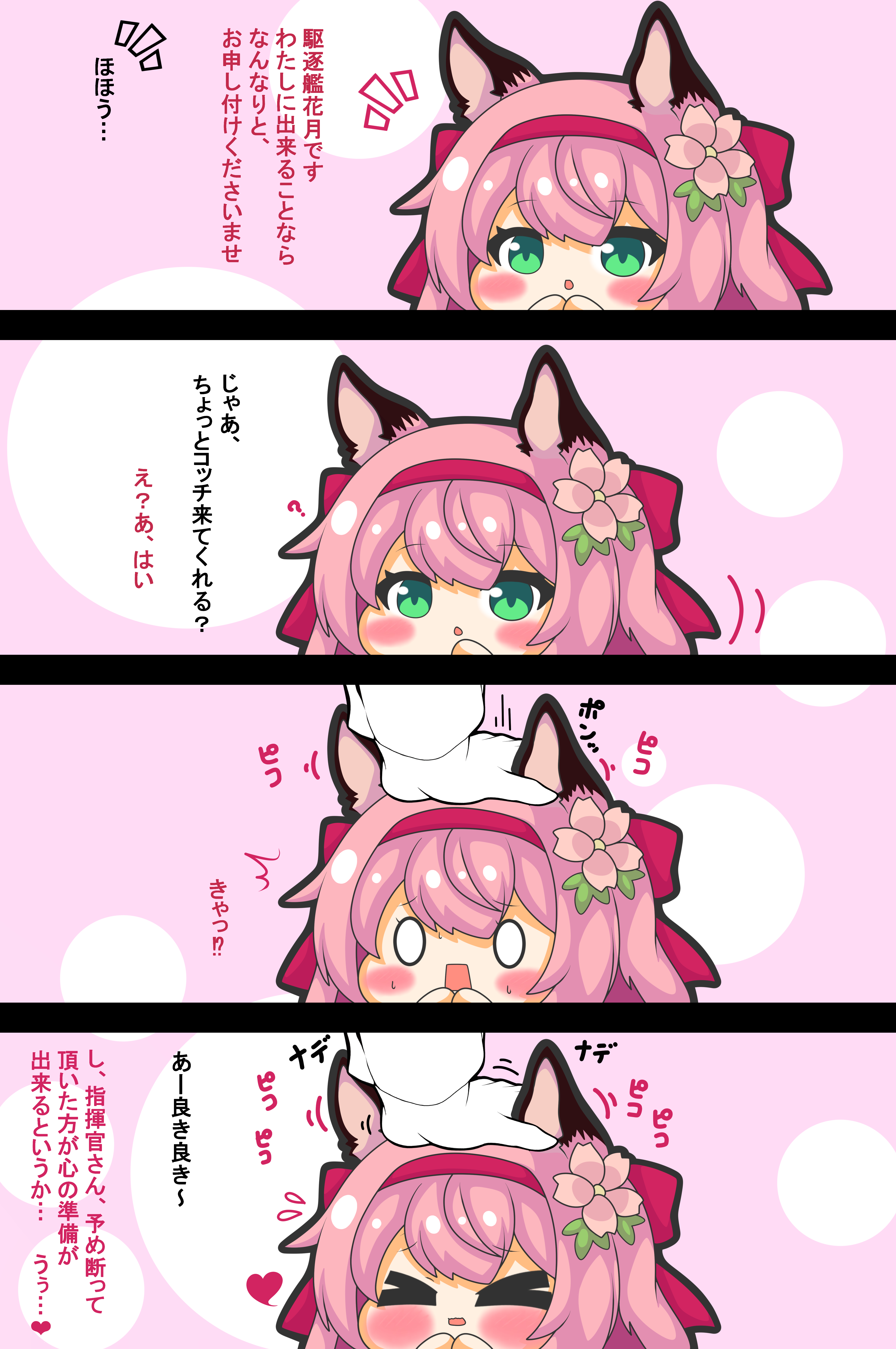 >_< 0_0 1girl 1other 4koma :o ^^^ absurdres animal_ears azur_lane blush comic commander_(azur_lane) commentary_request flower gloves green_eyes hair_between_eyes hair_flower hair_ornament hairband hanazuki_(azur_lane) hand_up hands_up headpat highres kurukurumagical long_sleeves motion_lines notice_lines out_of_frame parted_lips pink_flower pink_hair red_hairband surprised sweat translation_request white_gloves