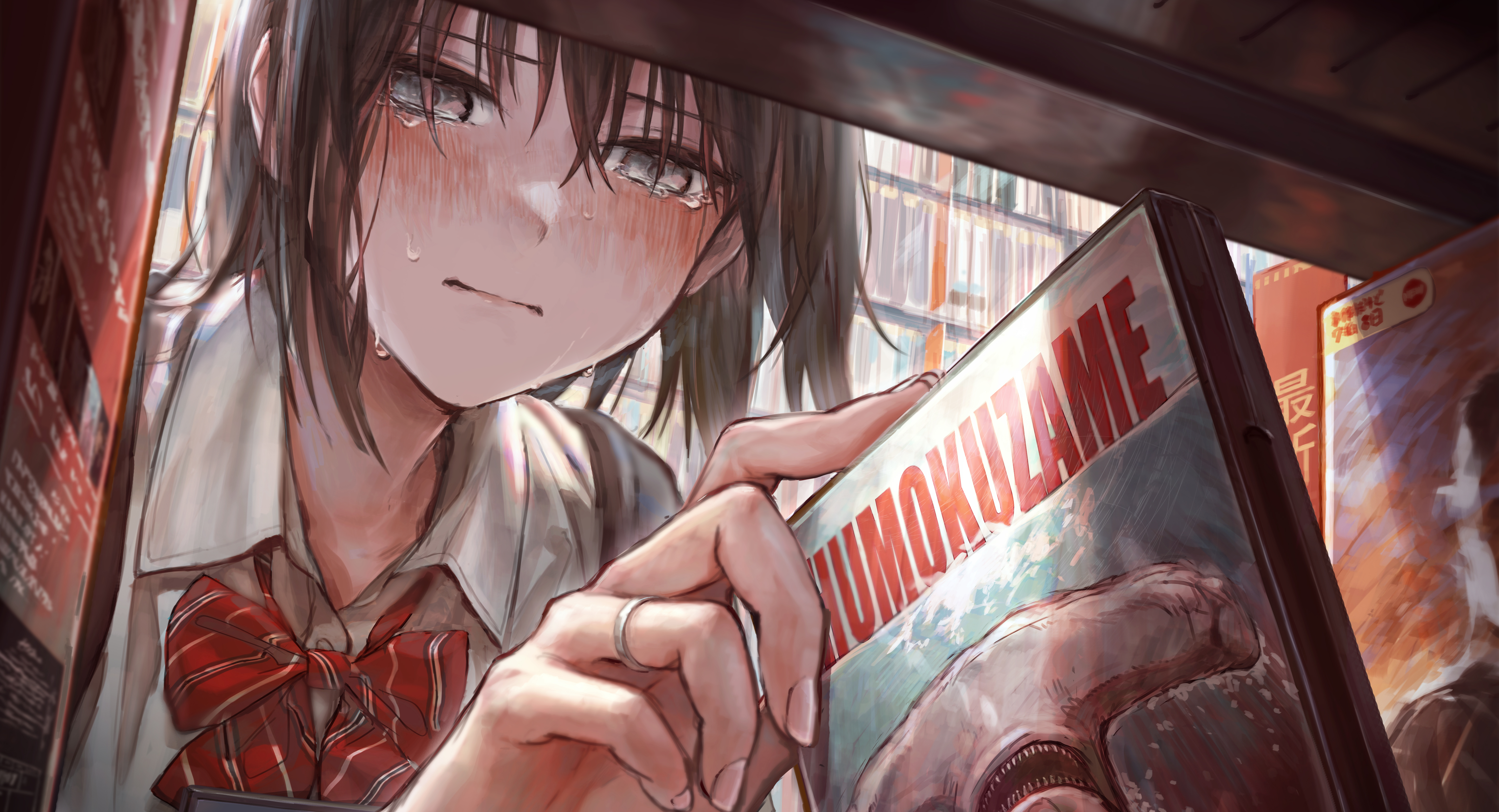 1girl absurdres blush bookshelf boots bow brown_hair closed_mouth collared_shirt commentary_request crying crying_with_eyes_open diagonal-striped_bow dress_shirt fingernails grey_eyes highres indoors jewelry nose_blush original red_bow revision ring school_uniform shirt solo striped_bow tears tentsuu_(tentwo) white_shirt