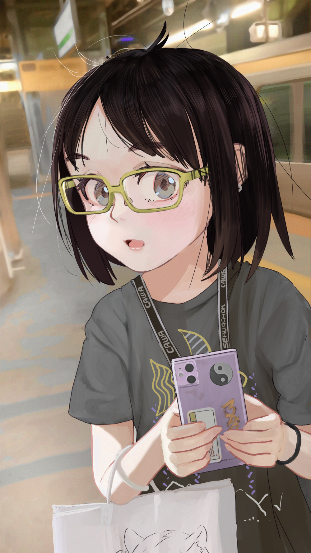 1girl animal_print artist_name bag black_hair black_shirt blurry blurry_background blush bob_cut bracelet casual cellphone character_name commentary cowlick depth_of_field dutch_angle earrings elbow_carry eyelashes fish_print glasses green-framed_eyewear grey_eyes hair_strand highres holding holding_bag holding_phone indoors jewelry lanyard lips looking_at_viewer messy_hair open_mouth original own_hands_together paper_bag phone russian_commentary russian_text sasha_(servachok) servachok shirt shopping_bag short_hair short_sleeves smartphone solo standing sticker subway subway_station swept_bangs t-shirt thick_eyebrows train train_station train_station_platform upper_body w_arms yin_yang