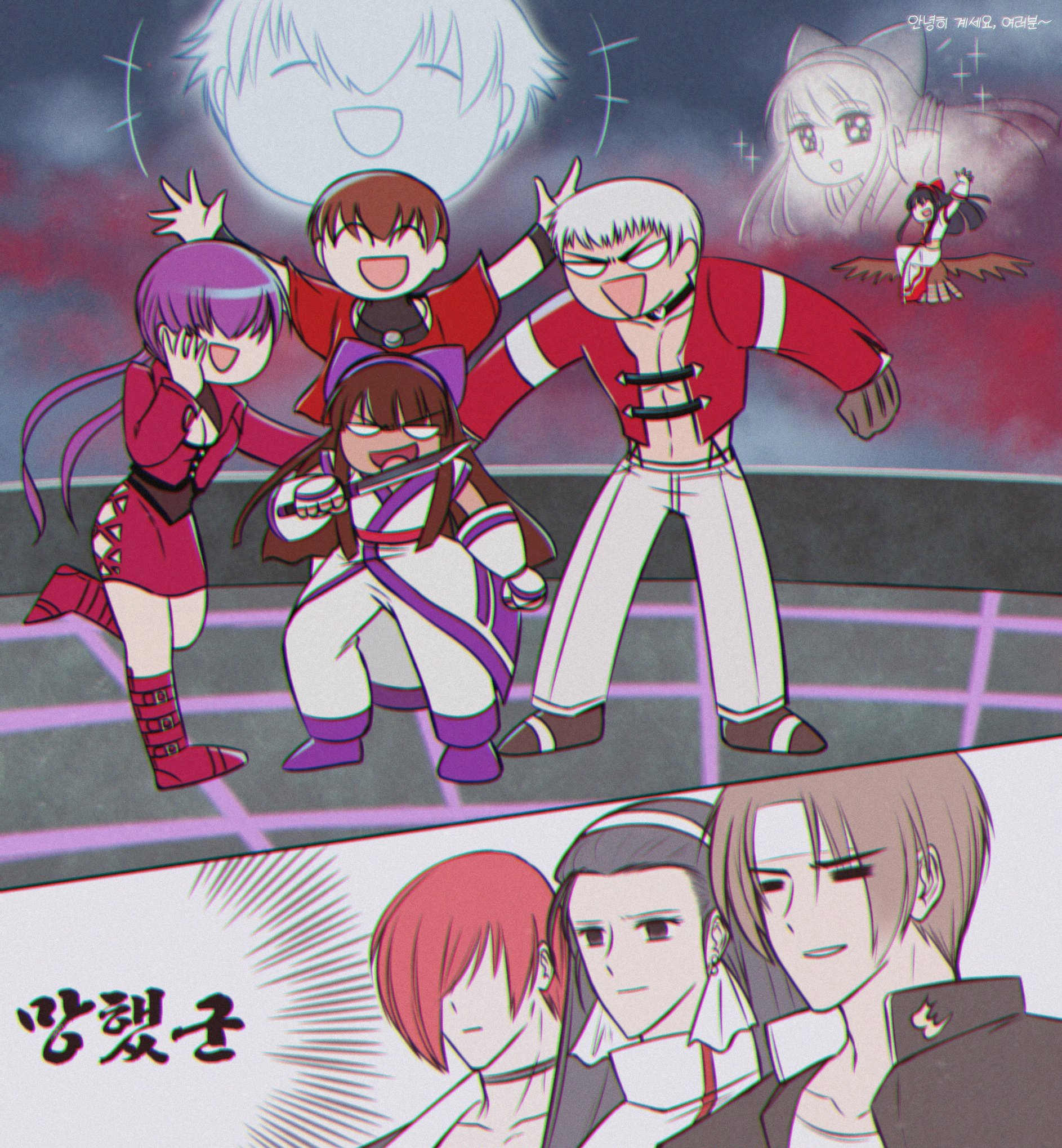 4boys 4girls ainu_clothes bow breasts brown_hair chris_(kof) cleavage closed_eyes crossover dark_persona evil_smile expressionless faceless faceless_male fingerless_gloves gloves hair_bow hair_ribbon happy highres kagura_chizuru kusanagi_kyou legs long_hair mamahaha medium_breasts multiple_boys multiple_girls murasaki_nakoruru nakoruru nanakase_yashiro open_mouth orochi_(kof) orochi_chris orochi_shermie orochi_yashiro pants possessed possession purple_hair red_hair ribbon samurai_spirits shermie_(kof) smile snk the_king_of_fighters thighs weapon white_eyes white_hair yagami_iori